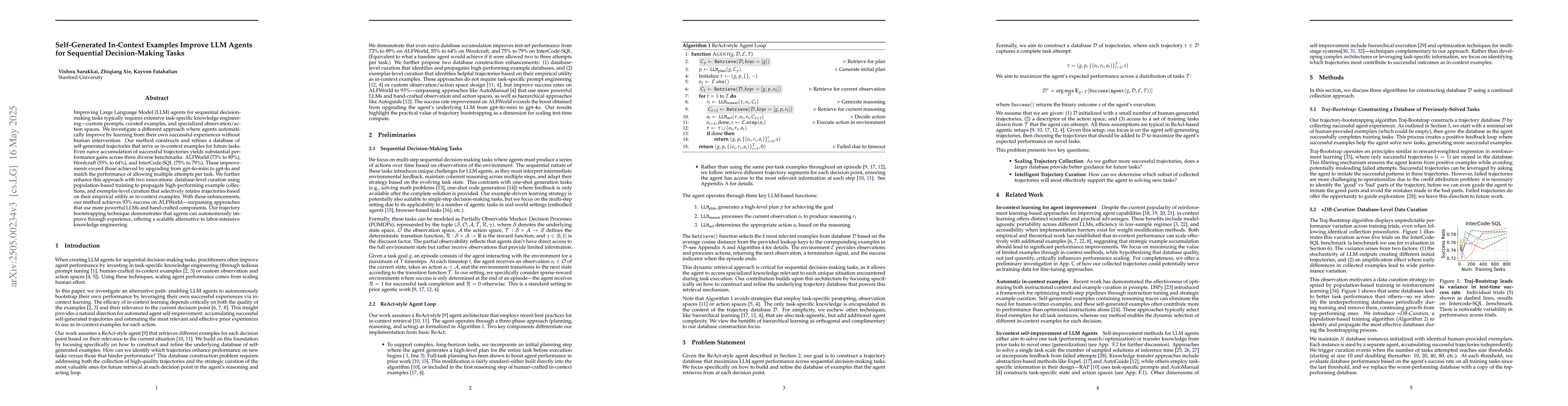 This paper explores how Large Language Model (LLM) agents can enhance their performance in sequential decision-making tasks by generating and refining their own in-context examples from successful experiences, rather than relying on task-specific knowledge engineering. The study shows significant performance improvements across benchmarks and introduces methods for optimizing the selection of these self-generated examples to further boost results.