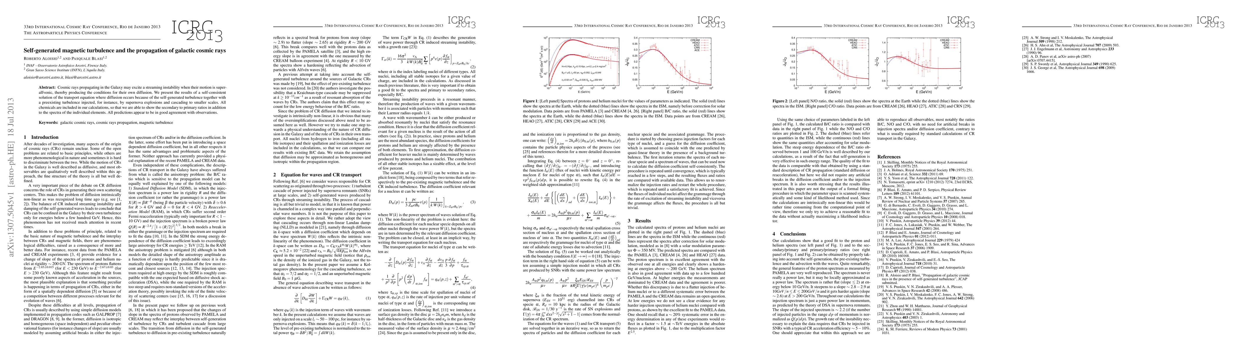 Cosmic rays propagating in the Galaxy may excite a streaming instability when their motion is super-alfvenic, thereby producing the conditions for their own diffusion. We present the results of a self-consistent solution of the transport equation where diffusion occurs because of the self-generated turbulence together with a preexisting turbulence injected, for instance, by supernova explosions and cascading to smaller scales. All chemicals are included in our calculations, so that we are able to show the secondary to primary ratios in addition to the spectra of the individual elements. All predictions appear to be in good agreement with observations.