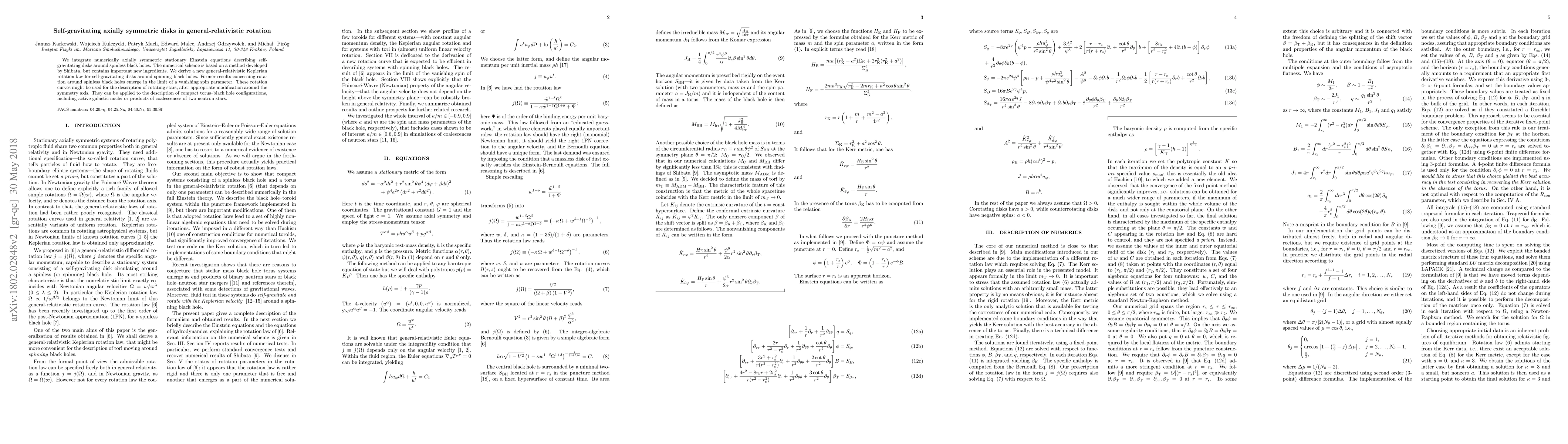 This paper numerically solves the general-relativistic Einstein equations for axially symmetric, stationary disks around black holes, introducing a new method and deriving a general-relativistic Keplerian rotation law. The results can describe the rotation of stars and compact torus-black hole systems, including active galactic nuclei and neutron star mergers.