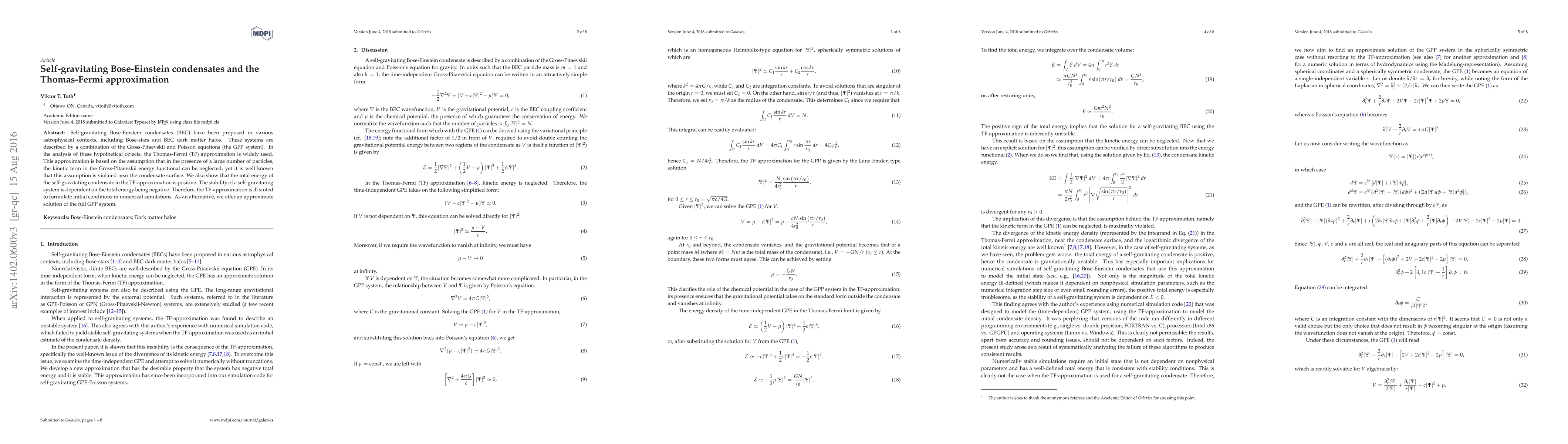 This paper investigates self-gravitating Bose-Einstein condensates described by the GPP system, highlighting limitations of the Thomas-Fermi approximation due to its violation near the surface. An alternative approximate solution to the full GPP system is proposed for numerical simulations.