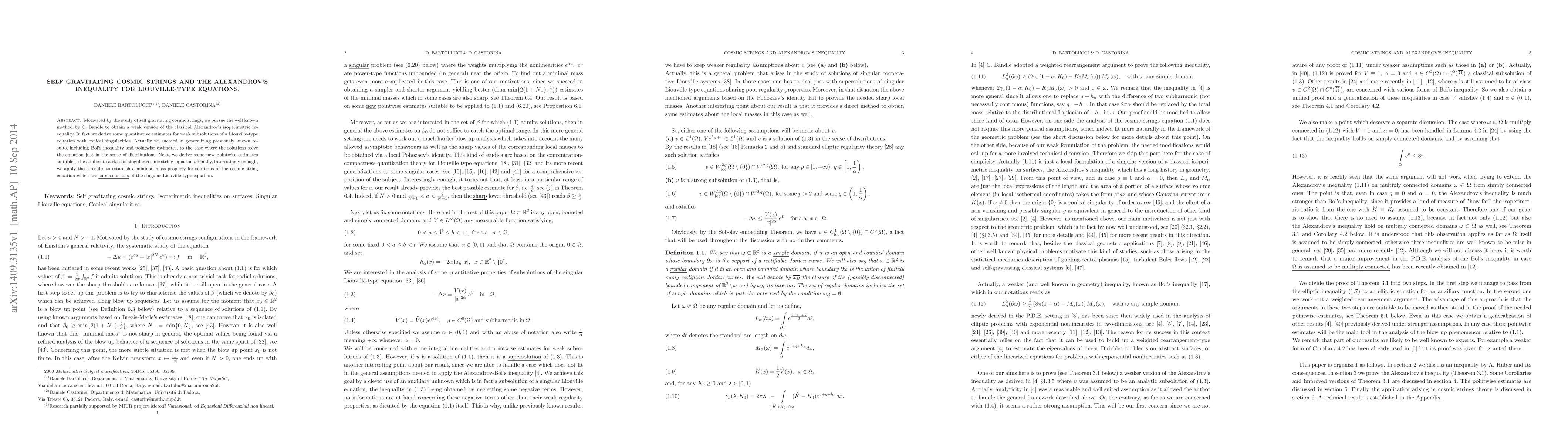 Motivated by the study of self gravitating cosmic strings, we pursue the well known method by C. Bandle to obtain a weak version of the classical Alexandrov's isoperimetric inequality. In fact we derive some quantitative estimates for weak subsolutions of a Liouville-type equation with conical singularities. Actually we succeed in generalizing previously known results, including Bol's inequality and pointwise estimates, to the case where the solutions solve the equation just in the sense of distributions. Next, we derive some \uv{new} pointwise estimates suitable to be applied to a class of singular cosmic string equations. Finally, interestingly enough, we apply these results to establish a minimal mass property for solutions of the cosmic string equation which are \uv{supersolutions} of the singular Liouville-type equation.
