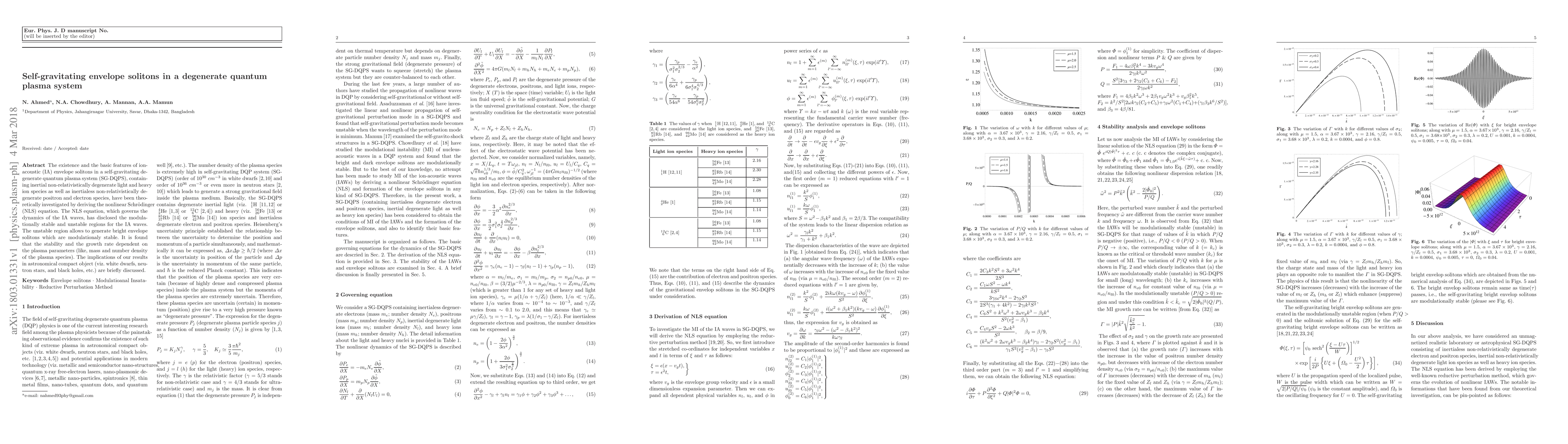 The existence and the basic features of ion-acoustic (IA) envelope solitons in a self-gravitating degenerate quantum plasma system (SG-DQPS), containing inertial non-relativistically degenerate light and heavy ion species as well as inertialess non-relativistically degenerate positron and electron species, have been theoretically investigated by deriving the nonlinear Schr\"{o}dinger (NLS) equation. The NLS equation, which governs the dynamics of the IA waves, has disclosed the modulationally stable and unstable regions for the IA waves. The unstable region allows to generate bright envelope solitons which are modulationaly stable. It is found that the stability and the growth rate dependent on the plasma parameters (like, mass and number density of the plasma species). The implications of our results in astronomical compact object (viz. white dwarfs, neutron stars, and black holes, etc.) are briefly discussed.