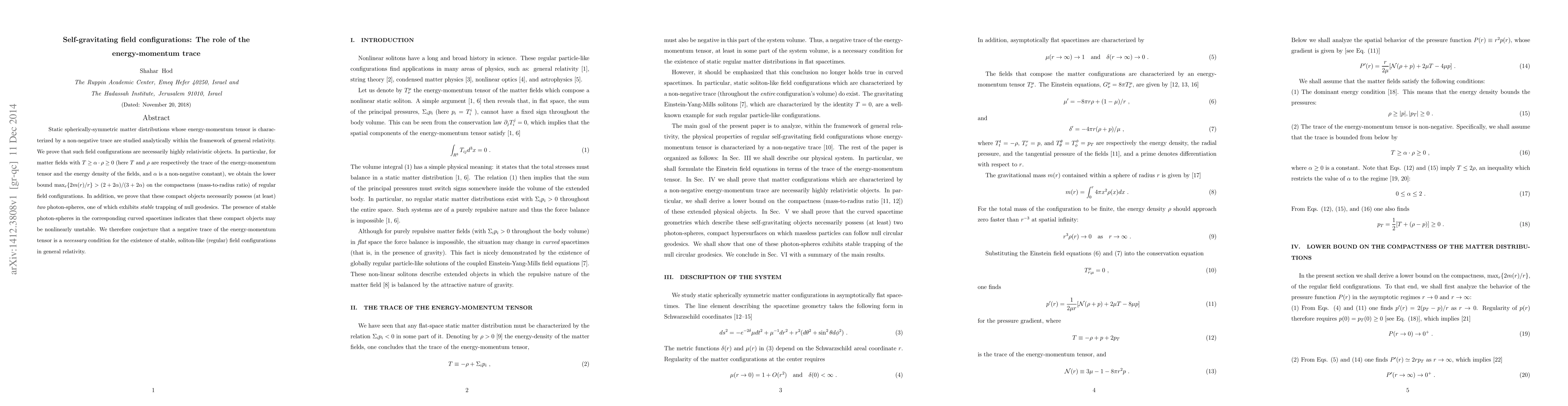 Static spherically-symmetric matter distributions whose energy-momentum tensor is characterized by a non-negative trace are studied analytically within the framework of general relativity. We prove that such field configurations are necessarily highly relativistic objects. In particular, for matter fields with $T\geq\alpha\cdot\rho\geq0$ (here $T$ and $\rho$ are respectively the trace of the energy-momentum tensor and the energy density of the fields, and $\alpha$ is a non-negative constant), we obtain the lower bound $\text{max}_r\{2m(r)/r\}>(2+2\alpha)/(3+2\alpha)$ on the compactness (mass-to-radius ratio) of regular field configurations. In addition, we prove that these compact objects necessarily possess (at least) {\it two} photon-spheres, one of which exhibits {\it stable} trapping of null geodesics. The presence of stable photon-spheres in the corresponding curved spacetimes indicates that these compact objects may be nonlinearly unstable. We therefore conjecture that a negative trace of the energy-momentum tensor is a {\it necessary} condition for the existence of stable, soliton-like (regular) field configurations in general relativity.