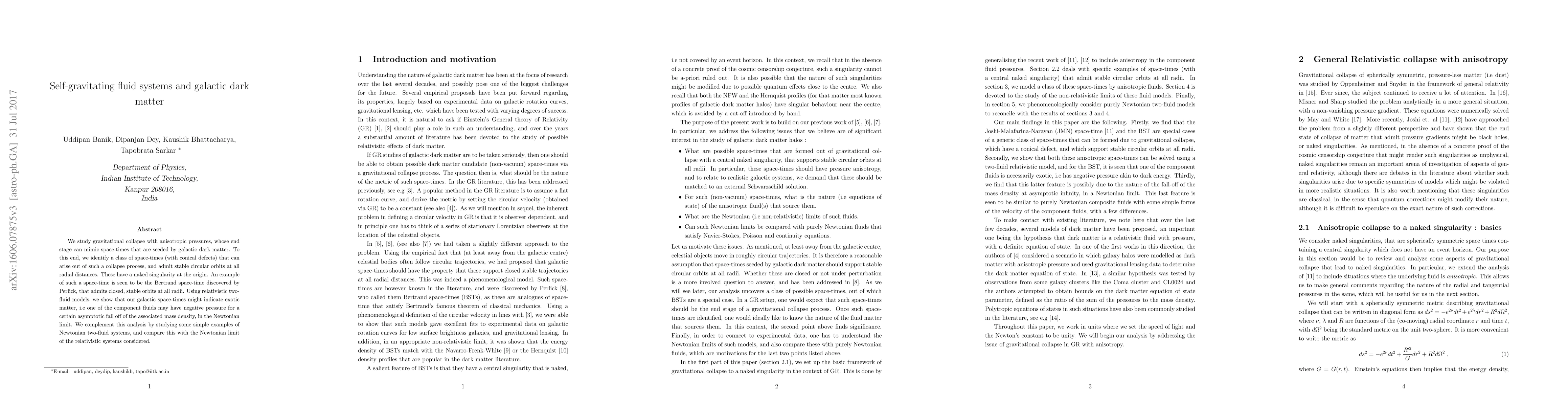 We study gravitational collapse with anisotropic pressures, whose end stage can mimic space-times that are seeded by galactic dark matter. To this end, we identify a class of space-times (with conical defects) that can arise out of such a collapse process, and admit stable circular orbits at all radial distances. These have a naked singularity at the origin. An example of such a space-time is seen to be the Bertrand space-time discovered by Perlick, that admits closed, stable orbits at all radii. Using relativistic two- fluid models, we show that our galactic space-times might indicate exotic matter, i.e one of the component fluids may have negative pressure for a certain asymptotic fall off of the associated mass density, in the Newtonian limit. We complement this analysis by studying some simple examples of Newtonian two-fluid systems, and compare this with the Newtonian limit of the relativistic systems considered.