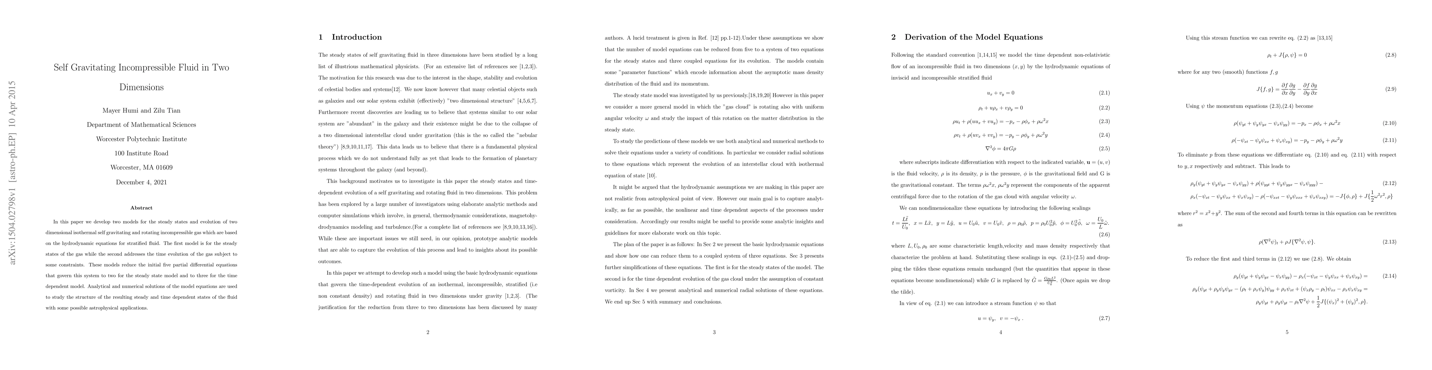 Researchers developed two models to study the steady states and evolution of a self-gravitating, incompressible gas in 2D, reducing complex equations to simpler ones for analysis.