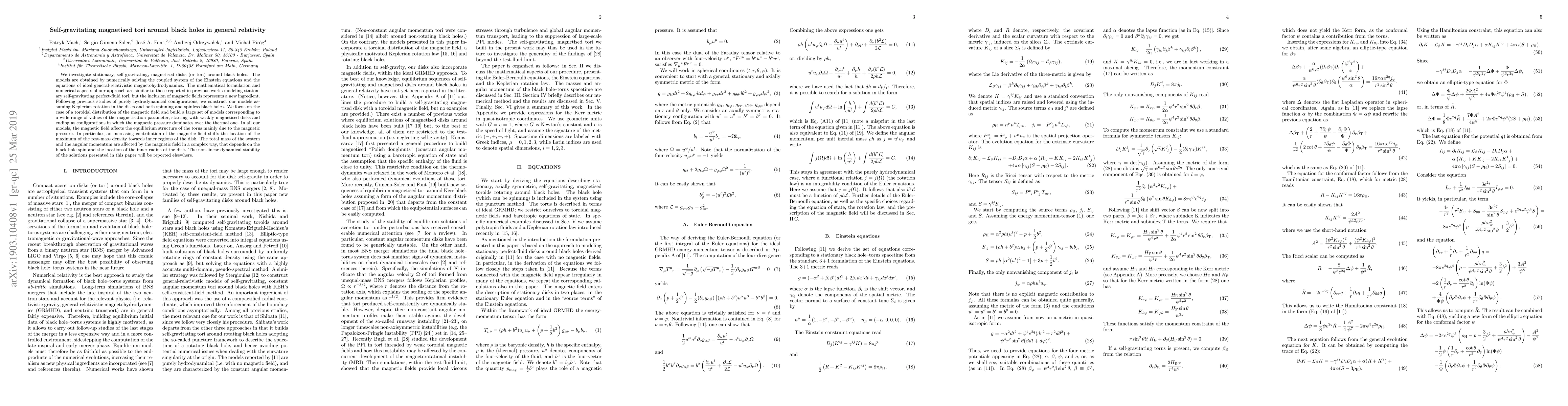 This paper investigates stationary, self-gravitating, magnetised tori around black holes by numerically solving the Einstein equations and ideal general-relativistic magnetohydrodynamics. The magnetic field primarily influences the torus's equilibrium structure through magnetic pressure, shifting the density maximum inward, while its effect on total mass and angular momentum varies with black hole spin and disk inner radius.