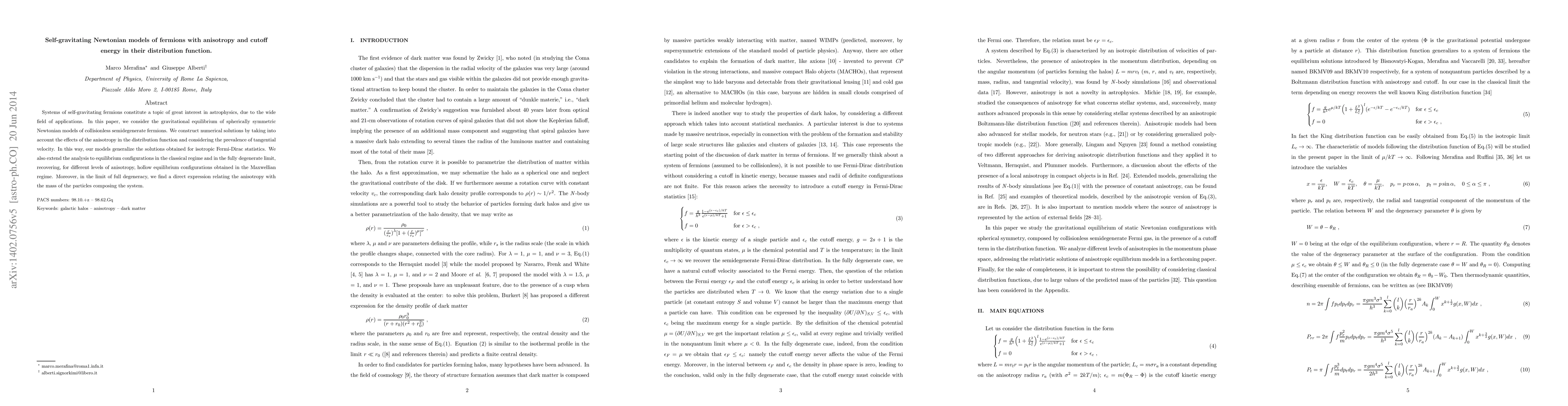 This paper investigates the gravitational equilibrium of spherically symmetric Newtonian models of self-gravitating fermions, considering anisotropic distribution functions and cutoff energy. It generalizes isotropic Fermi-Dirac solutions and finds hollow equilibrium configurations in various regimes, linking anisotropy directly with particle mass in full degeneracy.