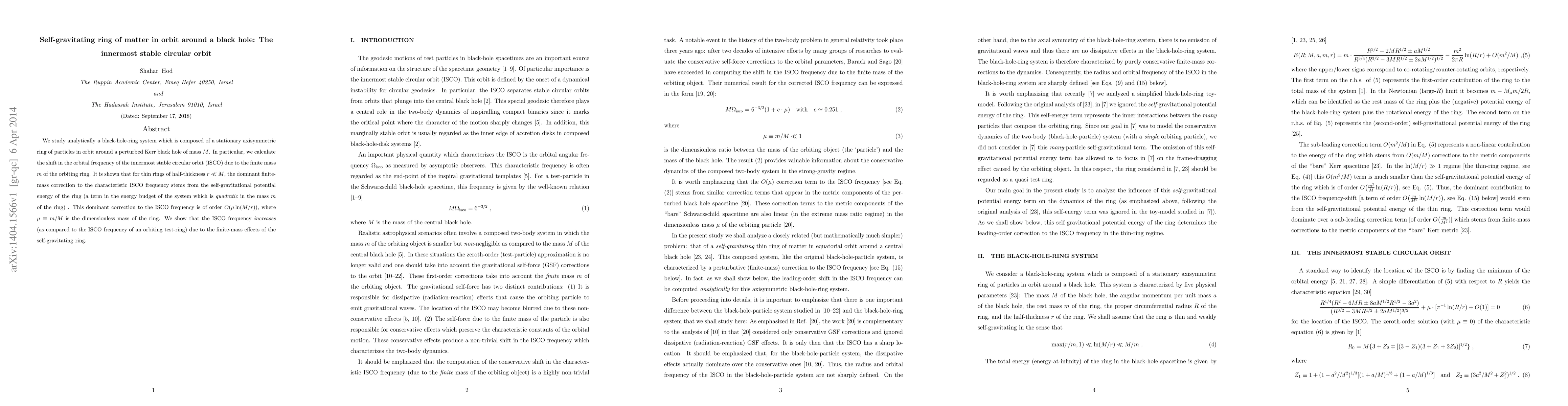 We study analytically a black-hole-ring system which is composed of a stationary axisymmetric ring of particles in orbit around a perturbed Kerr black hole of mass $M$. In particular, we calculate the shift in the orbital frequency of the innermost stable circular orbit (ISCO) due to the finite mass $m$ of the orbiting ring. It is shown that for thin rings of half-thickness $r\ll M$, the dominant finite-mass correction to the characteristic ISCO frequency stems from the self-gravitational potential energy of the ring (a term in the energy budget of the system which is quadratic in the mass $m$ of the ring). This dominant correction to the ISCO frequency is of order $O(\mu\ln(M/r))$, where $\mu\equiv m/M$ is the dimensionless mass of the ring. We show that the ISCO frequency increases (as compared to the ISCO frequency of an orbiting test-ring) due to the finite-mass effects of the self-gravitating ring.