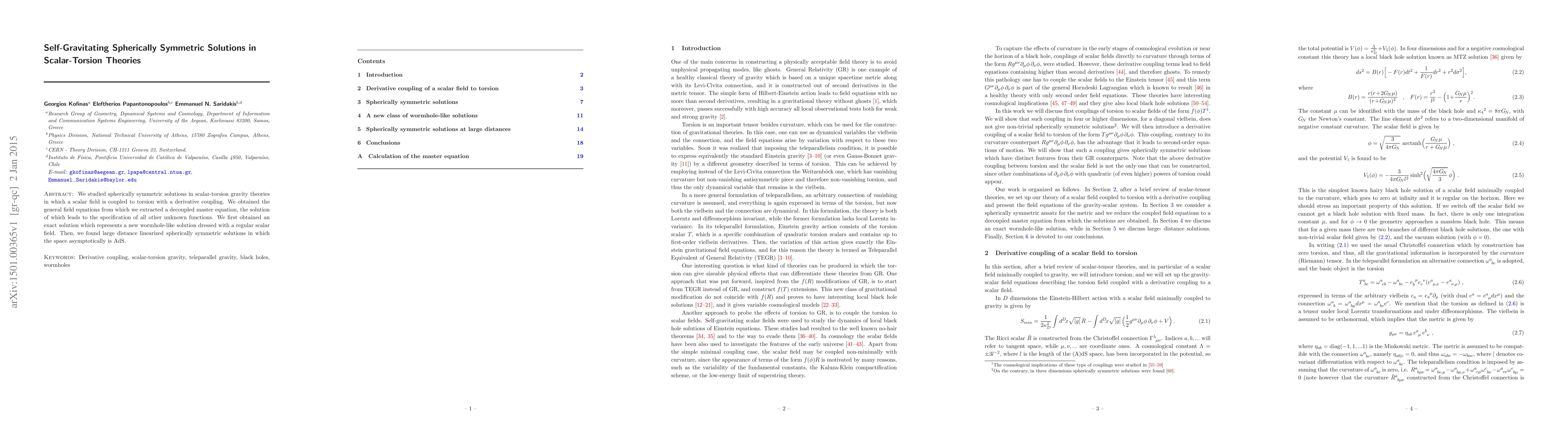 This paper investigates spherically symmetric solutions in scalar-torsion gravity theories, deriving a master equation from the general field equations. An exact wormhole-like solution with a regular scalar field and large distance AdS-asymptotics is presented.