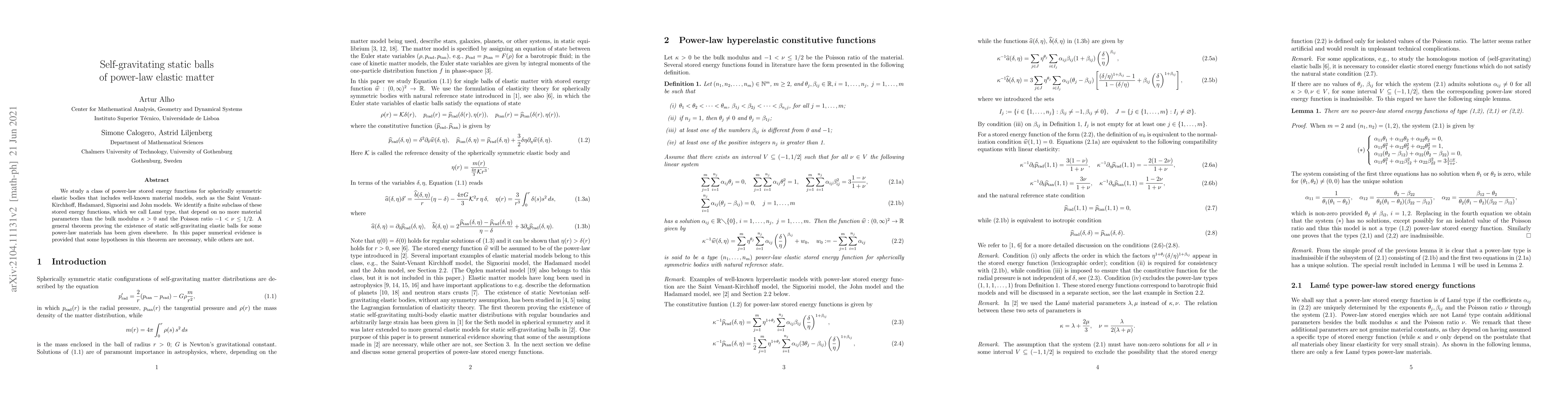 We study a class of power-law stored energy functions for spherically symmetric elastic bodies that includes well-known material models, such as the Saint Venant-Kirchhoff, Hadamard, Signorini and John models. We identify a finite subclass of these stored energy functions, which we call Lam\'e type, that depend on no more material parameters than the bulk modulus $\kappa>0$ and the Poisson ratio $-1<\nu\leq1/2$. A general theorem proving the existence of static self-gravitating elastic balls for some power-law materials has been given elsewhere. In this paper numerical evidence is provided that some hypotheses in this theorem are necessary, while others are not.