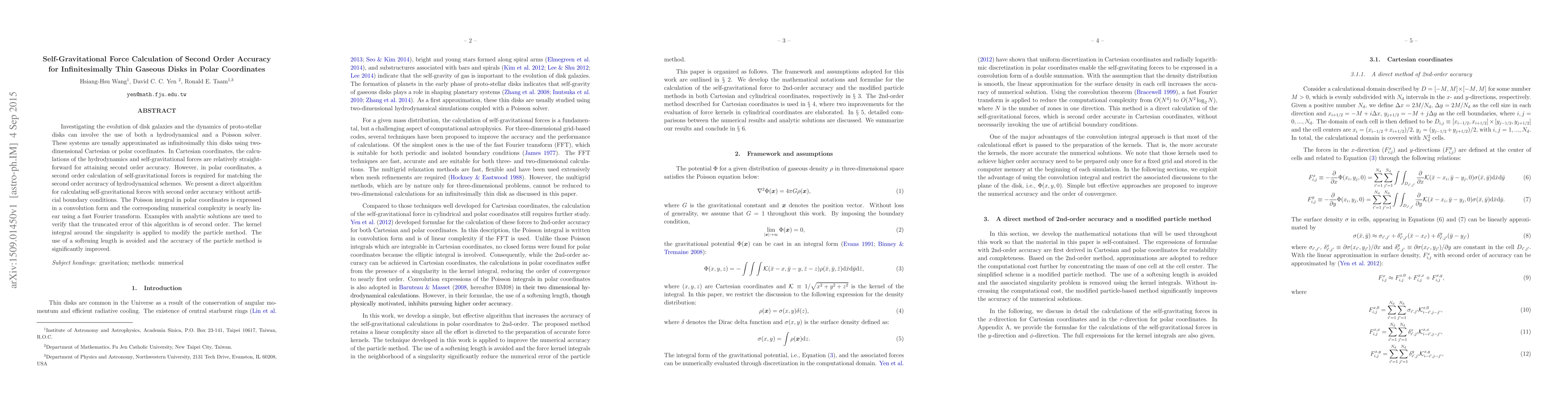 Investigating the evolution of disk galaxies and the dynamics of proto-stellar disks can involve the use of both a hydrodynamical and a Poisson solver. These systems are usually approximated as infinitesimally thin disks using two- dimensional Cartesian or polar coordinates. In Cartesian coordinates, the calcu- lations of the hydrodynamics and self-gravitational forces are relatively straight- forward for attaining second order accuracy. However, in polar coordinates, a second order calculation of self-gravitational forces is required for matching the second order accuracy of hydrodynamical schemes. We present a direct algorithm for calculating self-gravitational forces with second order accuracy without artifi- cial boundary conditions. The Poisson integral in polar coordinates is expressed in a convolution form and the corresponding numerical complexity is nearly lin- ear using a fast Fourier transform. Examples with analytic solutions are used to verify that the truncated error of this algorithm is of second order. The kernel integral around the singularity is applied to modify the particle method. The use of a softening length is avoided and the accuracy of the particle method is significantly improved.