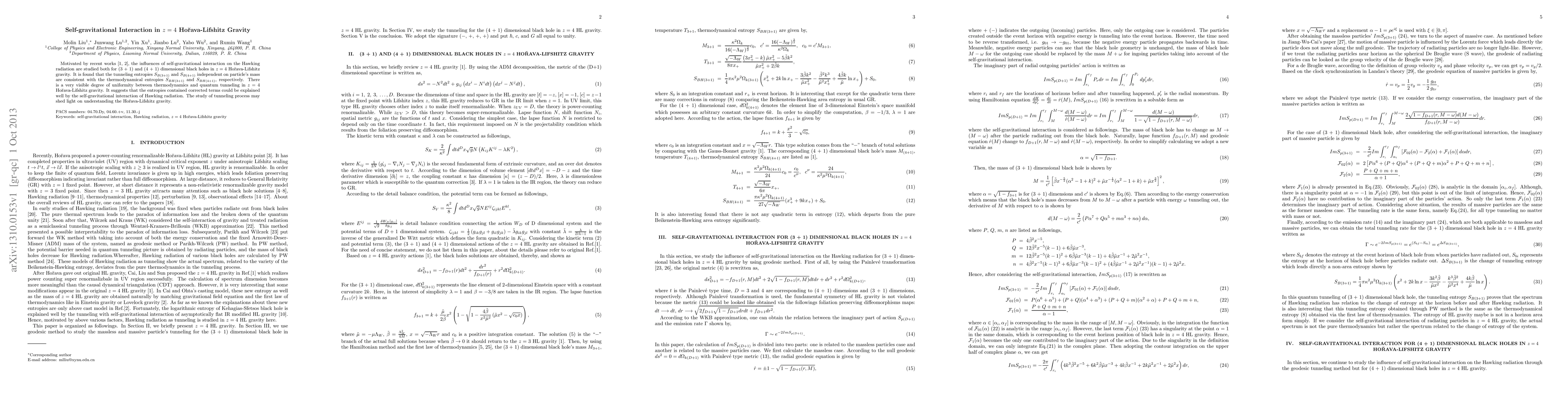 This paper investigates the self-gravitational interaction effects on Hawking radiation in (3+1) and (4+1) dimensional black holes within $z = 4$ Hořava-Lifshitz gravity, finding that tunneling entropies match thermodynamical entropies, suggesting a uniformity between thermodynamics and quantum tunneling in this gravity framework.