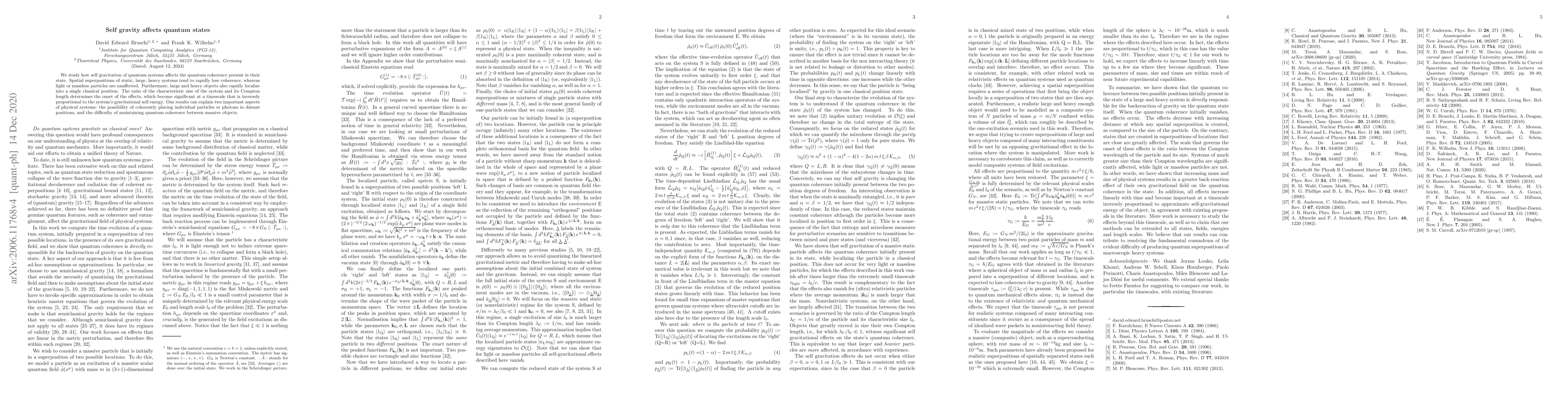 We study how self gravitation of quantum systems affects the quantum coherence present in their state. Spatial superpositions of static, large, heavy systems tend to rapidly lose coherence, whereas light or massless particles are unaffected. Furthermore, large and heavy objects also rapidly localize into a single classical position. The ratio of the characteristic size of the system and its Compton length determines the onset of the effects, which become significant at a timescale that is inversely proportional to the system's gravitational self energy. Our results can explain two important aspects of physical systems: the possibility of coherently placing individual particles or photons in distant positions, and the difficulty of maintaining quantum coherence between massive objects.