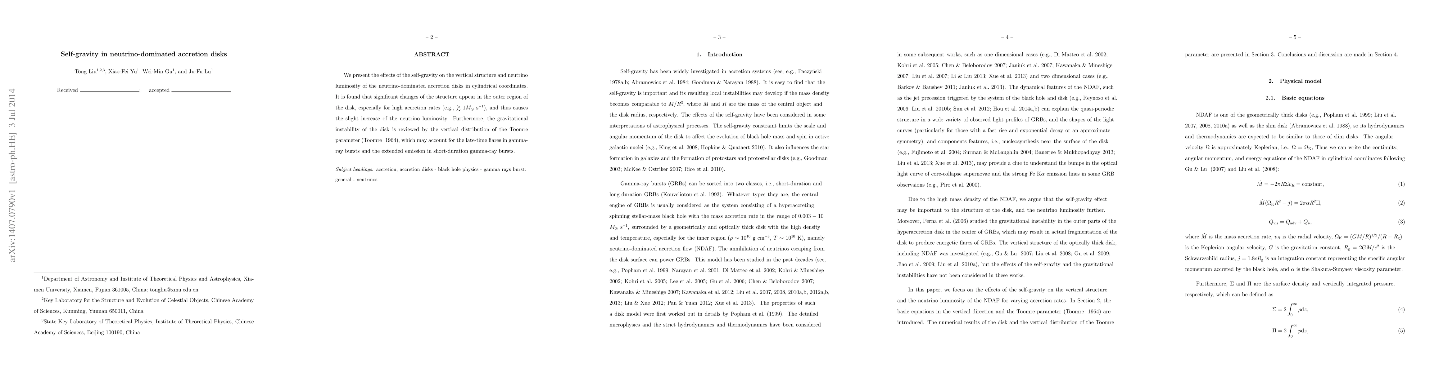 Research on neutrino-dominated accretion disks reveals that self-gravity significantly alters their structure, particularly at high accretion rates, leading to increased neutrino luminosity and potential late-time flares in gamma-ray bursts.