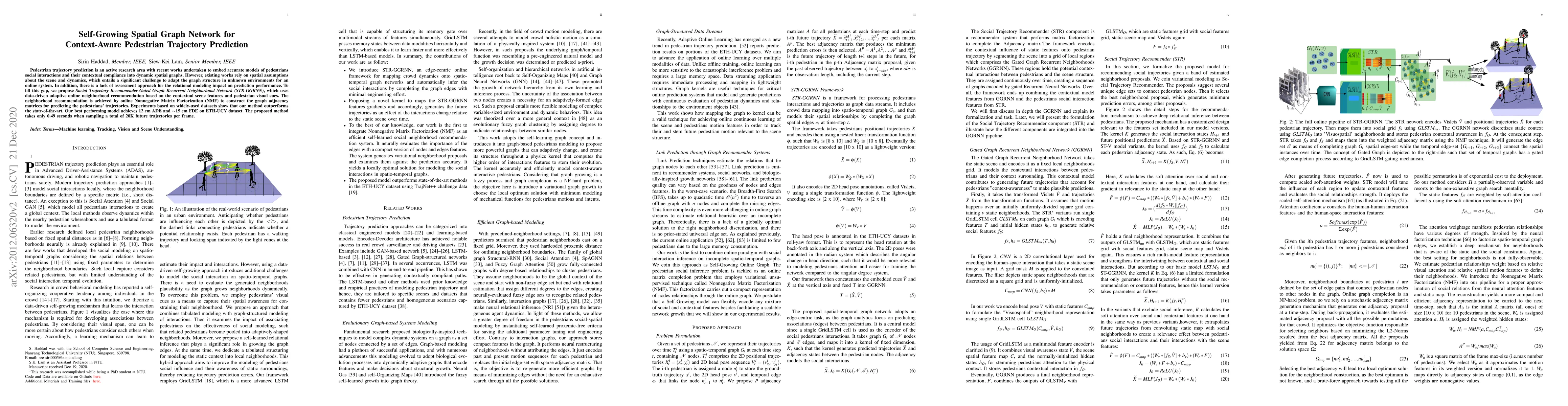 This paper proposes a Self-Growing Spatial Graph Network, STR-GGRNN, for context-aware pedestrian trajectory prediction, utilizing adaptive online neighborhood recommendation and Nonnegative Matrix Factorization to construct dynamic spatial graphs. The method outperforms existing models, achieving 12 cm ADE and ~15 cm FDE on ETH-UCY dataset with a prediction speed of 0.49 seconds per frame.