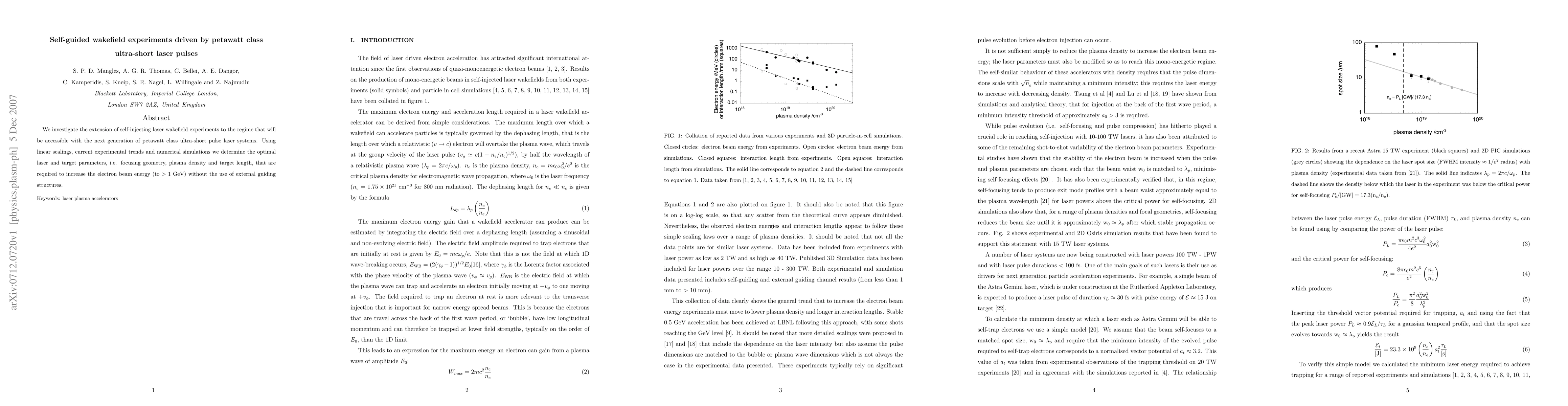 This paper explores the potential of petawatt-class ultra-short laser pulses to drive self-guided wakefield experiments, aiming to achieve electron beam energies exceeding 1 GeV without external guiding. It determines optimal laser and target parameters through simulations and experimental trends.