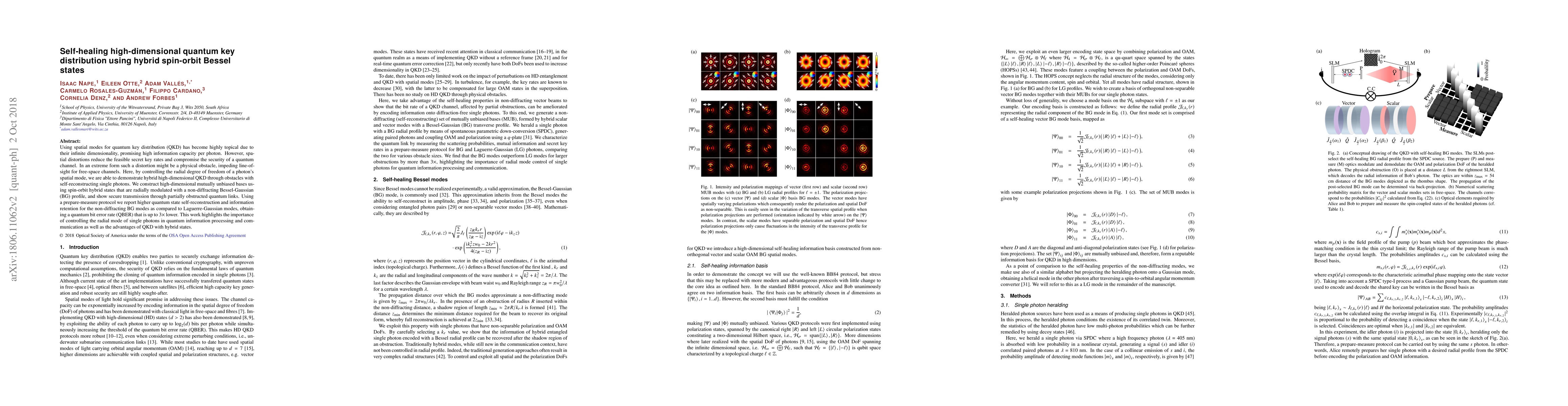 This paper demonstrates self-healing high-dimensional quantum key distribution (QKD) using hybrid spin-orbit Bessel states that can reconstruct and transmit secure keys through partially obstructed channels, achieving a quantum bit error rate (QBER) up to 3 times lower than traditional methods. The study highlights the benefits of controlling the radial mode of photons for enhanced QKD security and efficiency.