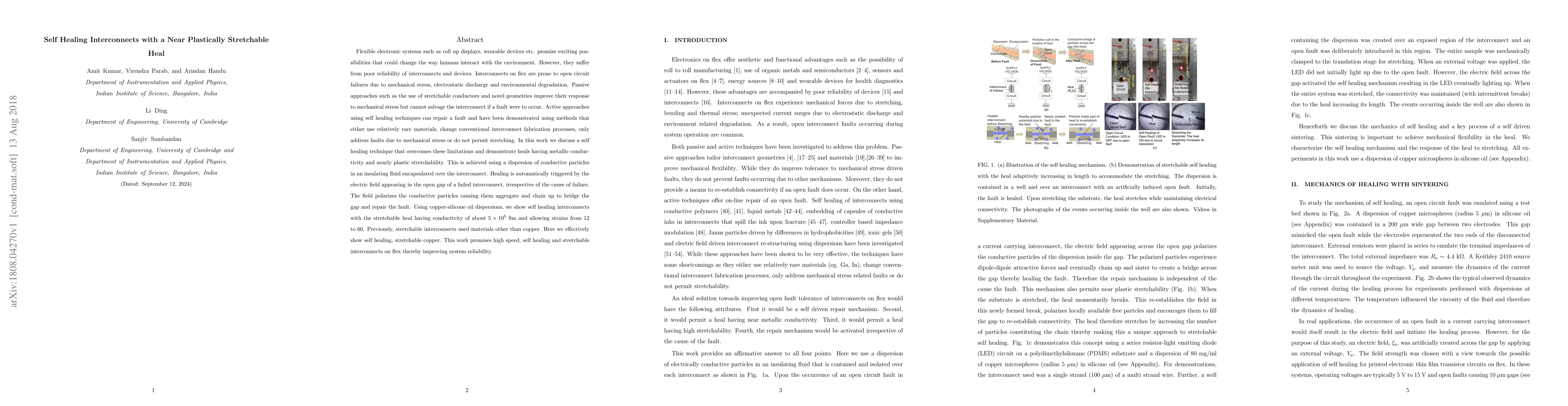 Flexible electronic systems such as roll up displays, wearable devices etc. promise exciting possibilities that could change the way humans interact with the environment. However, they suffer from poor reliability of interconnects and devices. Interconnects on flex are prone to open circuit failures due to mechanical stress, electrostatic discharge and environmental degradation. Passive approaches such as the use of stretchable conductors and novel geometries improve their response to mechanical stress but cannot salvage the interconnect if a fault were to occur. Active approaches using self healing techniques can repair a fault and have been demonstrated using methods that either use relatively rare materials, change conventional interconnect fabrication processes, only address faults due to mechanical stress or do not permit stretching. In this work we discuss a self healing technique that overcomes these limitations and demonstrate heals having metallic conductivity and nearly plastic stretchability. This is achieved using a dispersion of conductive particles in an insulating fluid encapsulated over the interconnect. Healing is automatically triggered by the electric field appearing in the open gap of a failed interconnect, irrespective of the cause of failure. The field polarizes the conductive particles causing them aggregate and chain up to bridge the gap and repair the fault. Using copper-silicone oil dispersions, we show self healing interconnects with the stretchable heal having conductivity of about $5 \times 10^{5}$ Sm and allowing strains from 12 to 60. Previously, stretchable interconnects used materials other than copper. Here we effectively show self healing, stretchable copper. This work promises high speed, self healing and stretchable interconnects on flex thereby improving system reliability.