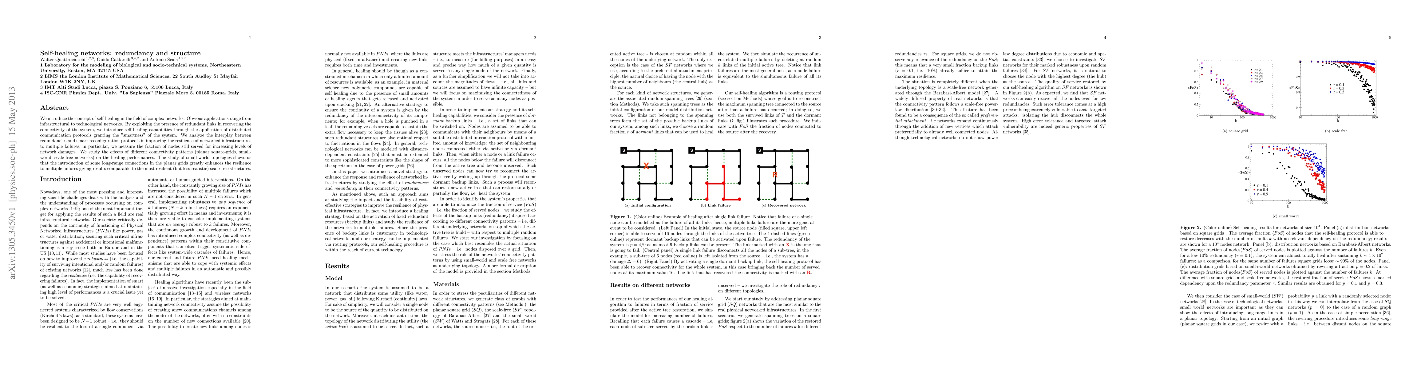 This paper explores self-healing networks using redundant links and distributed protocols to enhance resilience against multiple failures. It finds that small-world topologies with long-range connections offer high resilience comparable to scale-free networks, demonstrating the effectiveness of such structures in real-world applications.
