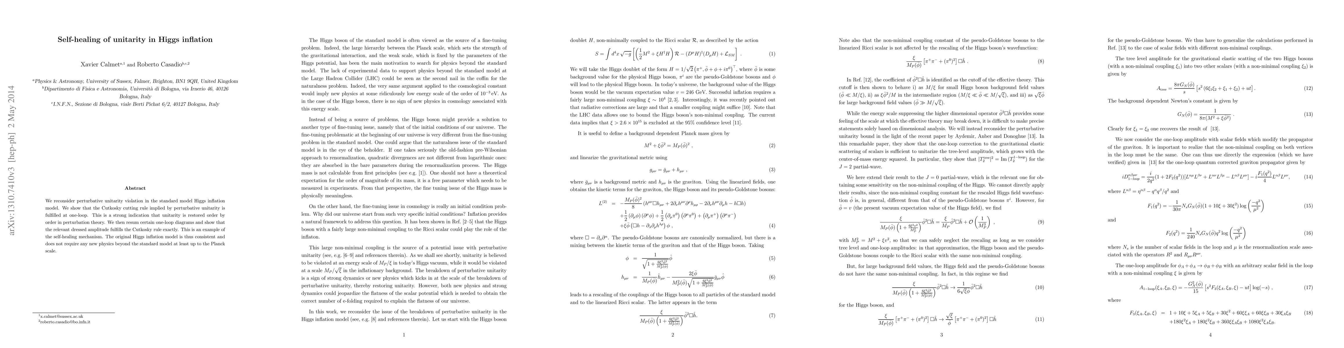We reconsider perturbative unitarity violation in the standard model Higgs inflation model. We show that the Cutkosky cutting rule implied by perturbative unitarity is fulfilled at one-loop. This is a strong indication that unitarity is restored order by order in perturbation theory. We then resum certain one-loop diagrams and show that the relevant dressed amplitude fulfills the Cutkosky rule exactly. This is an example of the self-healing mechanism. The original Higgs inflation model is thus consistent and does not require any new physics beyond the standard model at least up to the Planck scale.