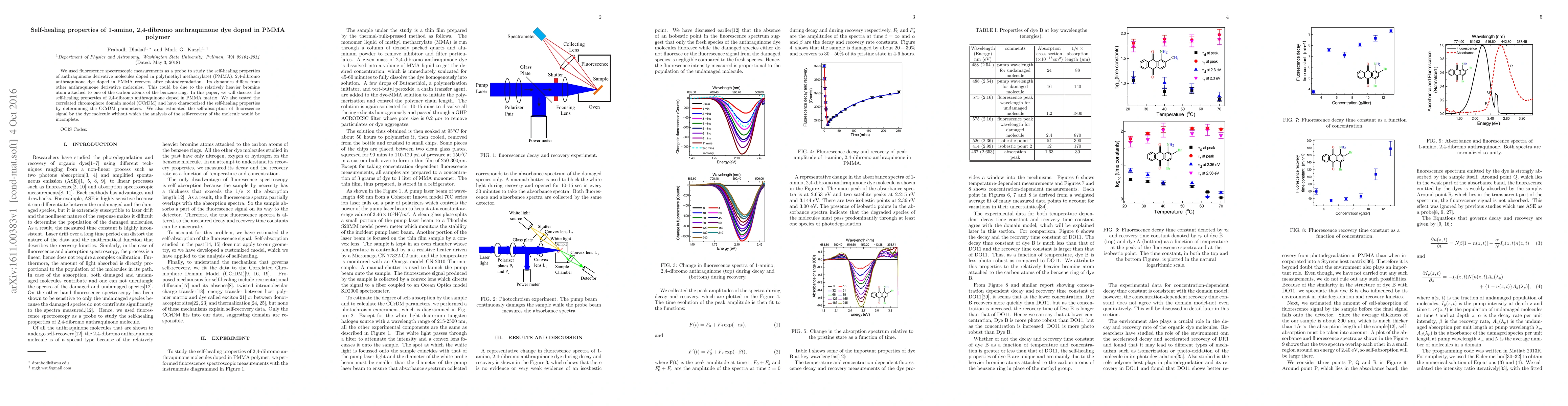We used fluorescence spectroscopic measurements as a probe to study the self-healing properties of anthraquinone derivative molecules doped in poly(methyl methacrylate) (PMMA). 2,4-dibromo anthraquinone dye doped in PMMA recovers after photodegradation. Its dynamics differs from other anthraquinone derivative molecules. This could be due to the relatively heavier bromine atom attached to one of the carbon atoms of the benzene ring. In this paper, we will discuss the self-healing properties of 2,4-dibromo anthraquinone doped in PMMA matrix. We also tested the correlated chromophore domain model (CCrDM) and have characterized the self-healing properties by determining the CCrDM parameters. We also estimated the self-absorption of fluorescence signal by the dye molecule without which the analysis of the self-recovery of the molecule would be incomplete.