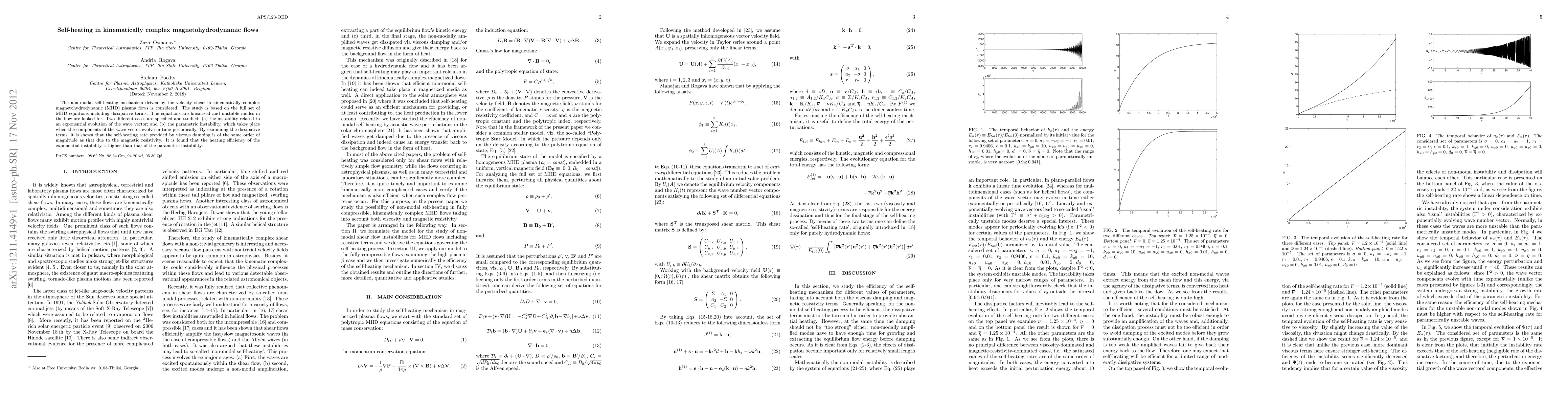 This paper investigates self-heating in complex magnetohydrodynamic (MHD) plasma flows driven by velocity shear, focusing on two types of instabilities: exponential and parametric. It finds that viscous damping and magnetic resistivity contribute comparably to self-heating, with the exponential instability proving more efficient in heating than the parametric one.