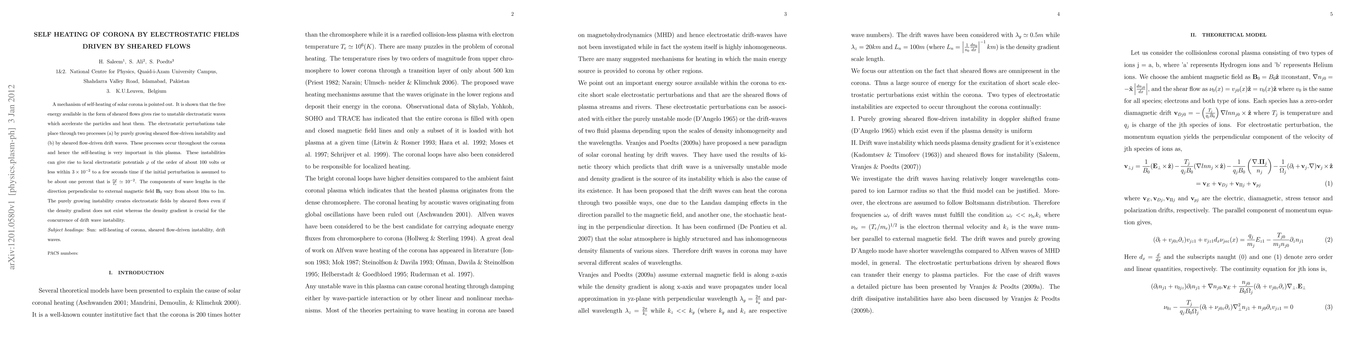 This paper explores a mechanism for the self-heating of the solar corona through electrostatic waves driven by sheared flows, which accelerate particles and generate local electrostatic potentials. The heating occurs via two processes: sheared flow-driven instability and drift waves, both of which are significant in coronal plasma.