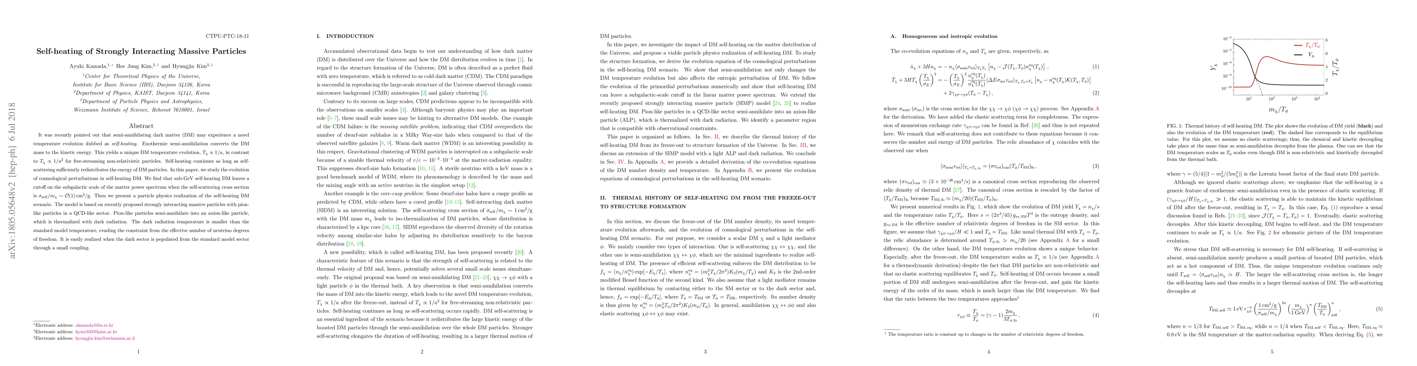It was recently pointed out that semi-annihilating dark matter (DM) may experience a novel temperature evolution dubbed as self-heating. Exothermic semi-annihilation converts the DM mass to the kinetic energy. This yields a unique DM temperature evolution, $T_{\chi} \propto 1 / a$, in contrast to $ T_{\chi} \propto 1 / a^{2}$ for free-streaming non-relativistic particles. Self-heating continues as long as self-scattering sufficiently redistributes the energy of DM particles. In this paper, we study the evolution of cosmological perturbations in self-heating DM. We find that sub-GeV self-heating DM leaves a cutoff on the subgalactic scale of the matter power spectrum when the self-scattering cross section is $\sigma_{\rm self} / m_{\chi} \sim {\cal O} (1) \,{\rm cm}^{2} /{\rm g}$. Then we present a particle physics realization of the self-heating DM scenario. The model is based on recently proposed strongly interacting massive particles with pion-like particles in a QCD-like sector. Pion-like particles semi-annihilate into an axion-like particle, which is thermalized with dark radiation. The dark radiation temperature is smaller than the standard model temperature, evading the constraint from the effective number of neutrino degrees of freedom. It is easily realized when the dark sector is populated from the standard model sector through a small coupling.