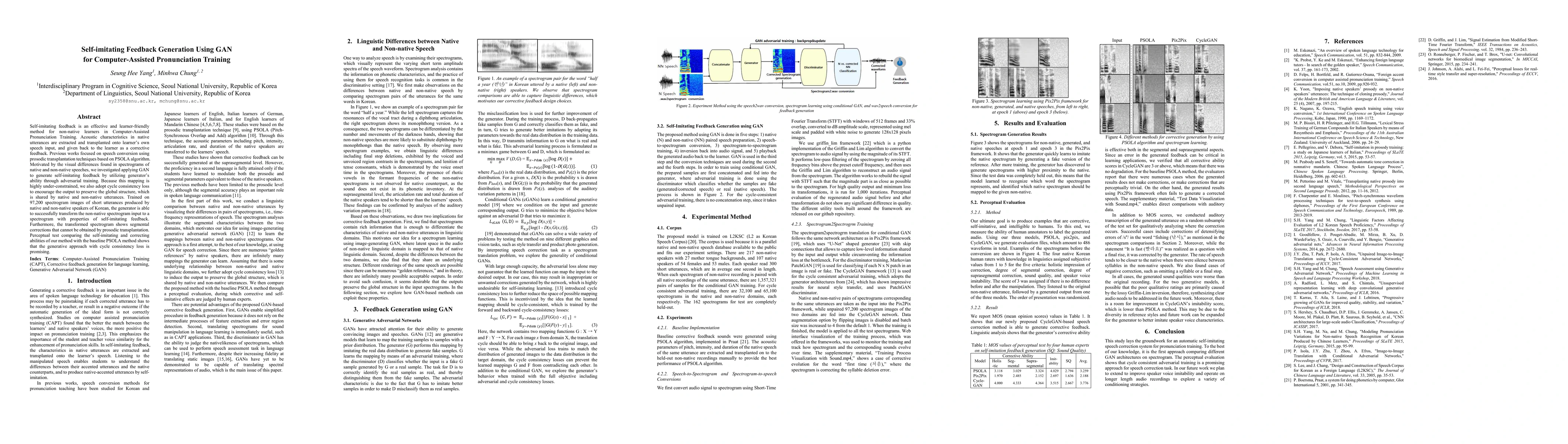 Self-imitating feedback is an effective and learner-friendly method for non-native learners in Computer-Assisted Pronunciation Training. Acoustic characteristics in native utterances are extracted and transplanted onto learner's own speech input, and given back to the learner as a corrective feedback. Previous works focused on speech conversion using prosodic transplantation techniques based on PSOLA algorithm. Motivated by the visual differences found in spectrograms of native and non-native speeches, we investigated applying GAN to generate self-imitating feedback by utilizing generator's ability through adversarial training. Because this mapping is highly under-constrained, we also adopt cycle consistency loss to encourage the output to preserve the global structure, which is shared by native and non-native utterances. Trained on 97,200 spectrogram images of short utterances produced by native and non-native speakers of Korean, the generator is able to successfully transform the non-native spectrogram input to a spectrogram with properties of self-imitating feedback. Furthermore, the transformed spectrogram shows segmental corrections that cannot be obtained by prosodic transplantation. Perceptual test comparing the self-imitating and correcting abilities of our method with the baseline PSOLA method shows that the generative approach with cycle consistency loss is promising.