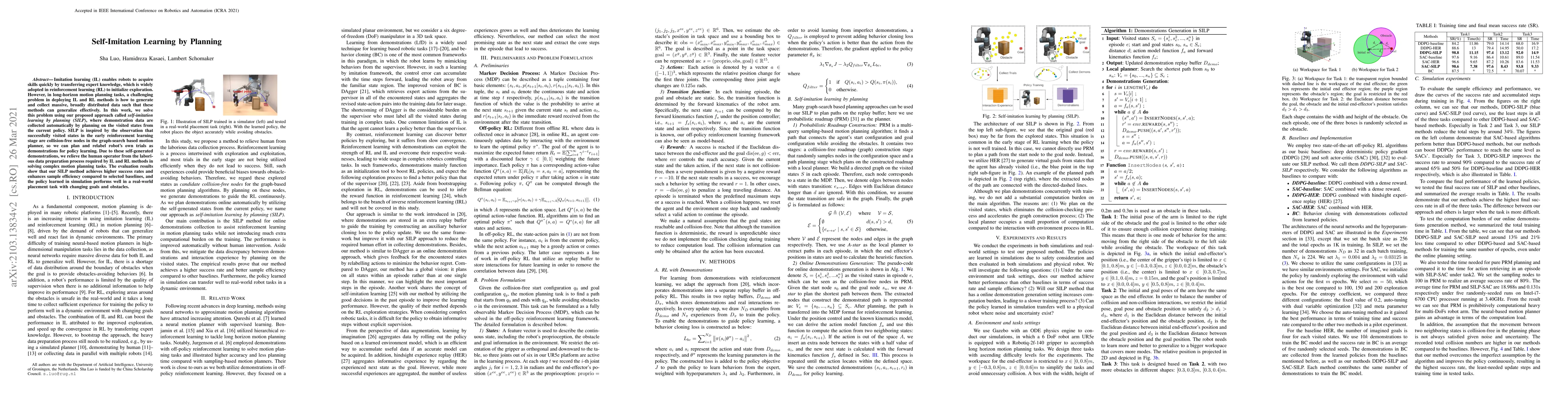 This paper proposes self-imitation learning by planning (SILP) to automate the collection of demonstration data for imitation learning in long-horizon motion planning tasks, achieving higher success rates and sample efficiency compared to baselines. SILP generates self-generated demonstrations by planning on visited states from the current policy, reducing the need for human data preparation.