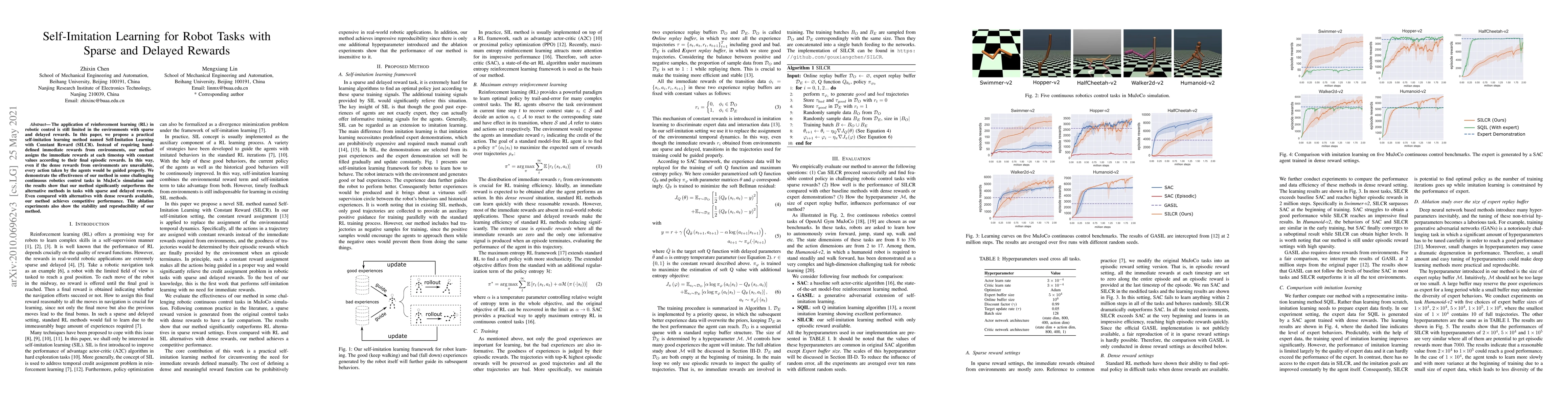 This paper proposes Self-Imitation Learning with Constant Reward (SILCR) to enhance reinforcement learning in robots facing sparse and delayed rewards. SILCR assigns constant immediate rewards based on final episodic rewards, guiding agents effectively even without dense rewards. The method outperforms alternatives in MuJoCo simulations for continuous control tasks.