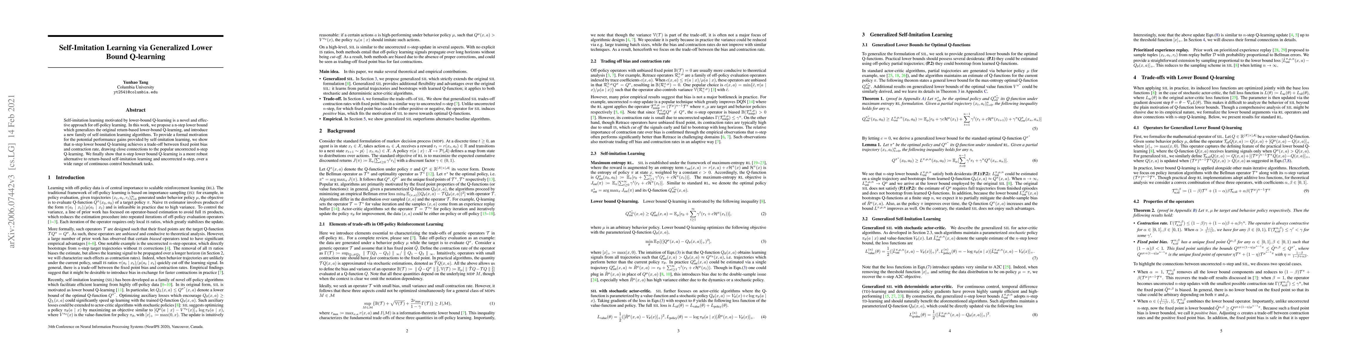 This paper proposes n-step lower bound Q-learning for self-imitation learning, showing it balances fixed point bias and contraction rate, and proves its robustness and effectiveness over traditional methods in continuous control tasks.