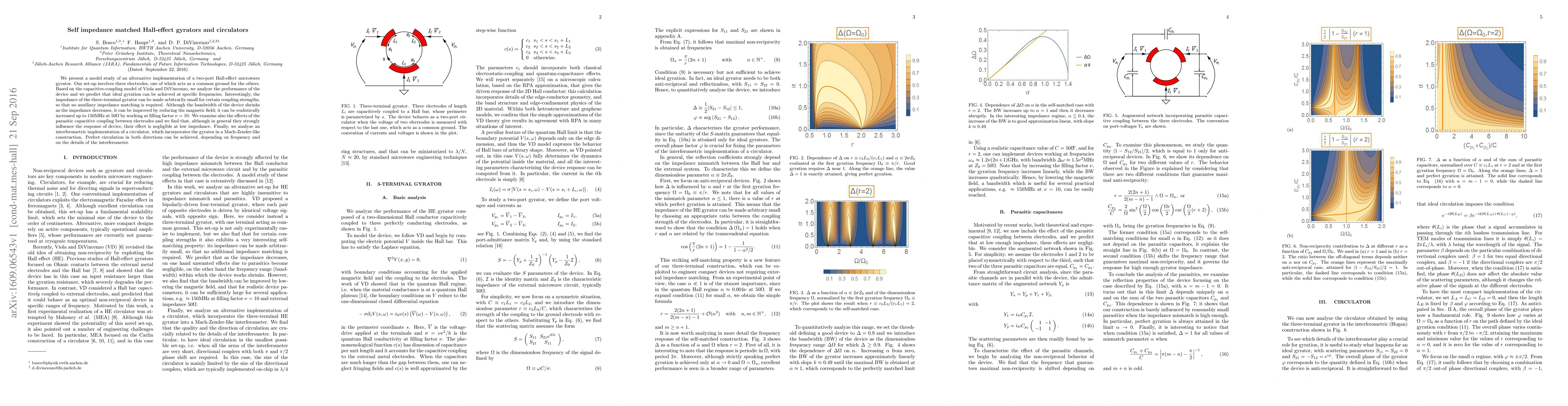 We present a model study of an alternative implementation of a two-port Hall-effect microwave gyrator. Our set-up involves three electrodes, one of which acts as a common ground for the others. Based on the capacitive-coupling model of Viola and DiVincenzo, we analyze the performance of the device and we predict that ideal gyration can be achieved at specific frequencies. Interestingly, the impedance of the three-terminal gyrator can be made arbitrarily small for certain coupling strengths, so that no auxiliary impedance matching is required. Although the bandwidth of the device shrinks as the impedance decreases, it can be improved by reducing the magnetic field; it can be realistically increased up to $ 150 \mathrm{MHz}$ at $50\mathrm{\Omega}$ by working at filling factor $\nu=10$. We examine also the effects of the parasitic capacitive coupling between electrodes and we find that, although in general they strongly influence the response of device, their effect is negligible at low impedance. Finally, we analyze an interferometric implementation of a circulator, which incorporates the gyrator in a Mach-Zender-like construction. Perfect circulation in both directions can be achieved, depending on frequency and on the details of the interferometer.