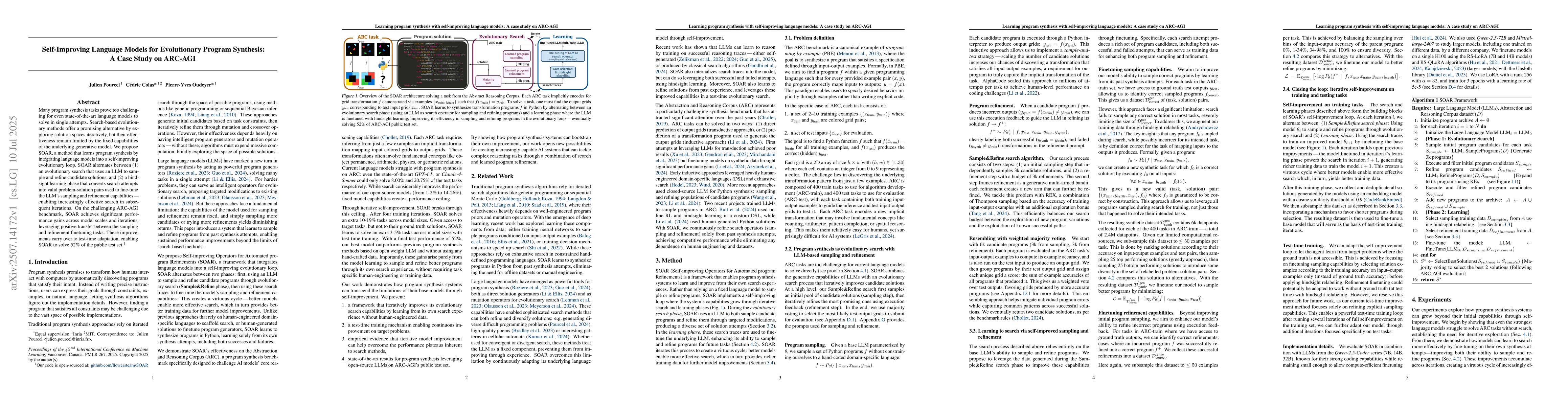 Many program synthesis tasks prove too challenging for even state-of-the-art language models to solve in single attempts. Search-based evolutionary methods offer a promising alternative by exploring solution spaces iteratively, but their effectiveness remain limited by the fixed capabilities of the underlying generative model. We propose SOAR, a method that learns program synthesis by integrating language models into a self-improving evolutionary loop. SOAR alternates between (1) an evolutionary search that uses an LLM to sample and refine candidate solutions, and (2) a hindsight learning phase that converts search attempts into valid problem-solution pairs used to fine-tune the LLM's sampling and refinement capabilities\, -- \,enabling increasingly effective search in subsequent iterations. On the challenging ARC-AGI benchmark, SOAR achieves significant performance gains across model scales and iterations, leveraging positive transfer between the sampling and refinement finetuning tasks. These improvements carry over to test-time adaptation, enabling SOAR to solve 52\% of the public test set. Our code is open-sourced at: https://github.com/flowersteam/SOAR