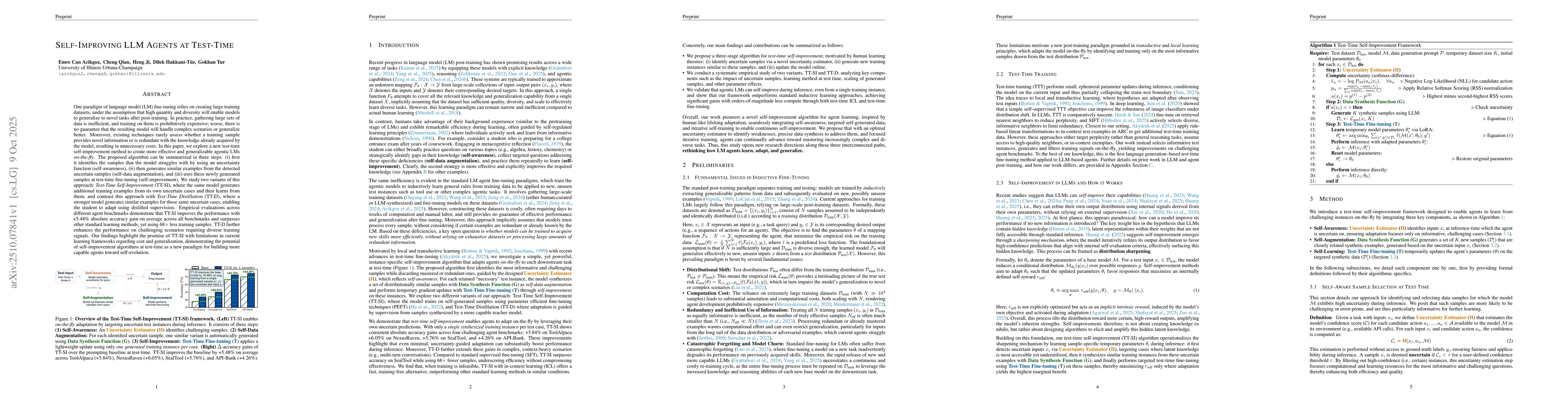 One paradigm of language model (LM) fine-tuning relies on creating large training datasets, under the assumption that high quantity and diversity will enable models to generalize to novel tasks after post-training. In practice, gathering large sets of data is inefficient, and training on them is prohibitively expensive; worse, there is no guarantee that the resulting model will handle complex scenarios or generalize better. Moreover, existing techniques rarely assess whether a training sample provides novel information or is redundant with the knowledge already acquired by the model, resulting in unnecessary costs. In this work, we explore a new test-time self-improvement method to create more effective and generalizable agentic LMs on-the-fly. The proposed algorithm can be summarized in three steps: (i) first it identifies the samples that model struggles with (self-awareness), (ii) then generates similar examples from detected uncertain samples (self-data augmentation), and (iii) uses these newly generated samples at test-time fine-tuning (self-improvement). We study two variants of this approach: Test-Time Self-Improvement (TT-SI), where the same model generates additional training examples from its own uncertain cases and then learns from them, and contrast this approach with Test-Time Distillation (TT-D), where a stronger model generates similar examples for uncertain cases, enabling student to adapt using distilled supervision. Empirical evaluations across different agent benchmarks demonstrate that TT-SI improves the performance with +5.48% absolute accuracy gain on average across all benchmarks and surpasses other standard learning methods, yet using 68x less training samples. Our findings highlight the promise of TT-SI, demonstrating the potential of self-improvement algorithms at test-time as a new paradigm for building more capable agents toward self-evolution.