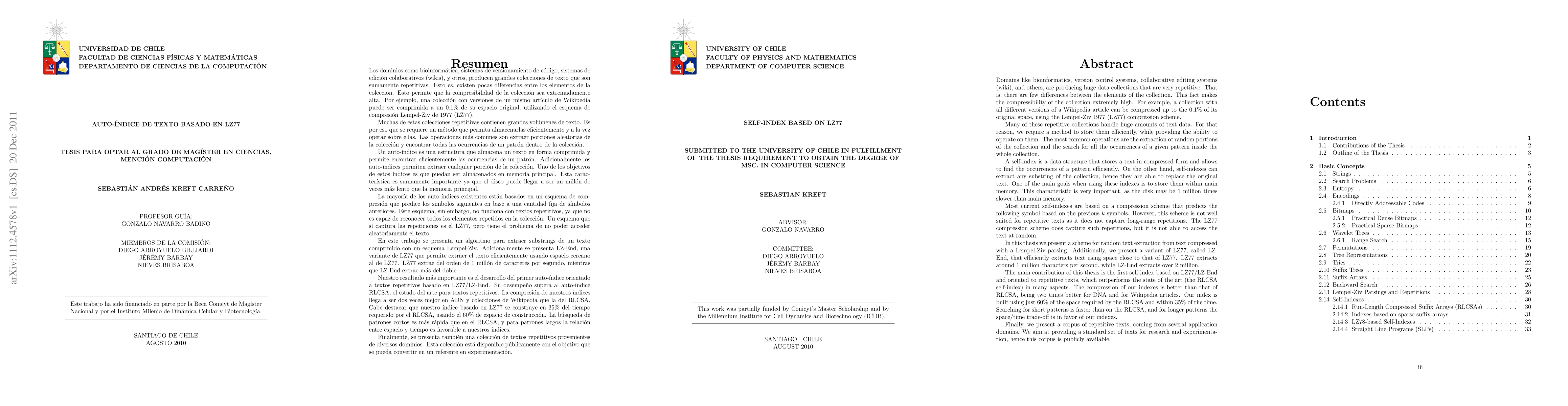 This thesis proposes a self-index based on LZ77 for efficiently storing and operating on highly repetitive text collections, achieving better performance than existing methods. It introduces LZ-End, a variant of LZ77, and provides a publicly available corpus of repetitive texts for research.