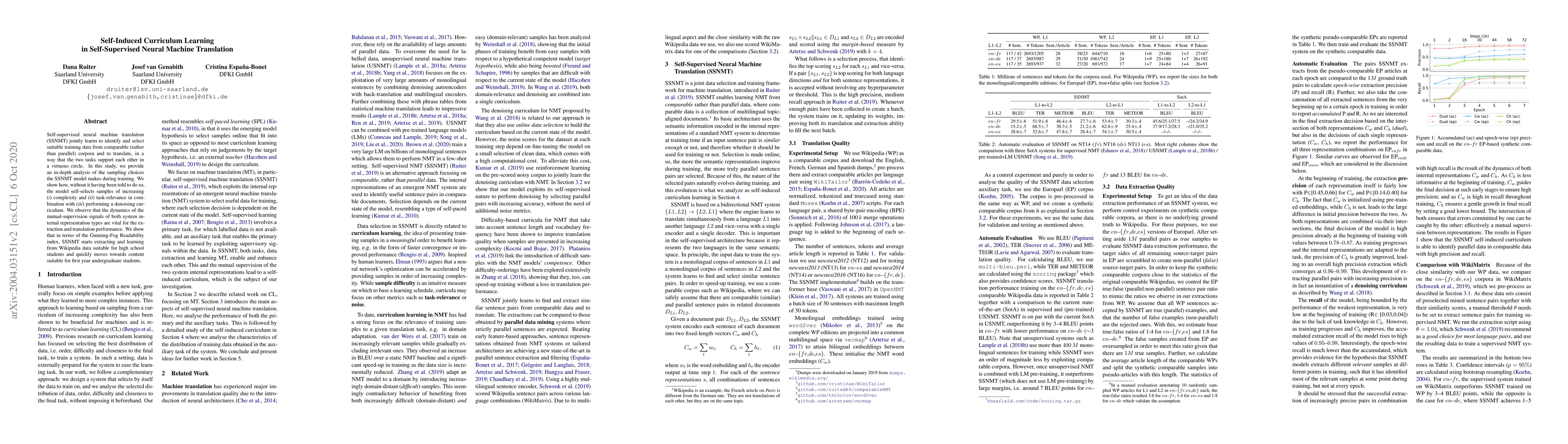 Self-supervised neural machine translation (SSNMT) jointly learns to identify and select suitable training data from comparable (rather than parallel) corpora and to translate, in a way that the two tasks support each other in a virtuous circle. In this study, we provide an in-depth analysis of the sampling choices the SSNMT model makes during training. We show how, without it having been told to do so, the model self-selects samples of increasing (i) complexity and (ii) task-relevance in combination with (iii) performing a denoising curriculum. We observe that the dynamics of the mutual-supervision signals of both system internal representation types are vital for the extraction and translation performance. We show that in terms of the Gunning-Fog Readability index, SSNMT starts extracting and learning from Wikipedia data suitable for high school students and quickly moves towards content suitable for first year undergraduate students.