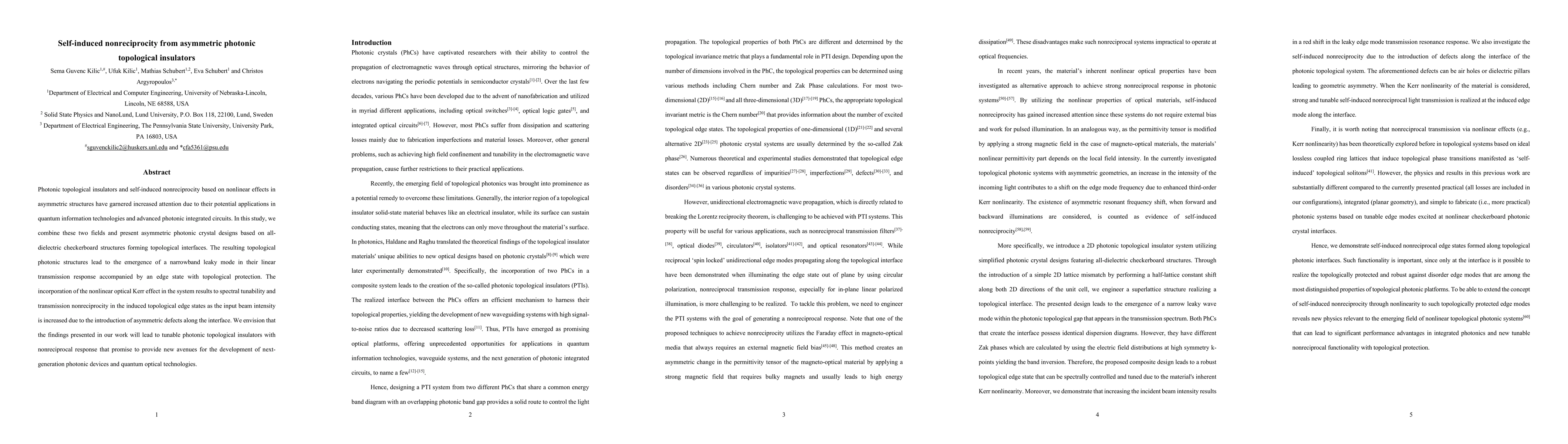 Photonic topological insulators and self-induced nonreciprocity based on nonlinear effects in asymmetric structures have garnered increased attention due to their potential applications in quantum information technologies and advanced photonic integrated circuits. In this study, we combine these two fields and present asymmetric photonic crystal designs based on all-dielectric checkerboard structures forming topological interfaces. The resulting topological photonic structures lead to the emergence of a narrowband leaky mode in their linear transmission response accompanied by an edge state with topological protection. The incorporation of the nonlinear optical Kerr effect in the system results to spectral tunability and transmission nonreciprocity in the induced topological edge states as the input beam intensity is increased due to the introduction of asymmetric defects along the interface. We envision that the findings presented in our work will lead to tunable photonic topological insulators with nonreciprocal response that promise to provide new avenues for the development of next-generation photonic devices and quantum optical technologies.