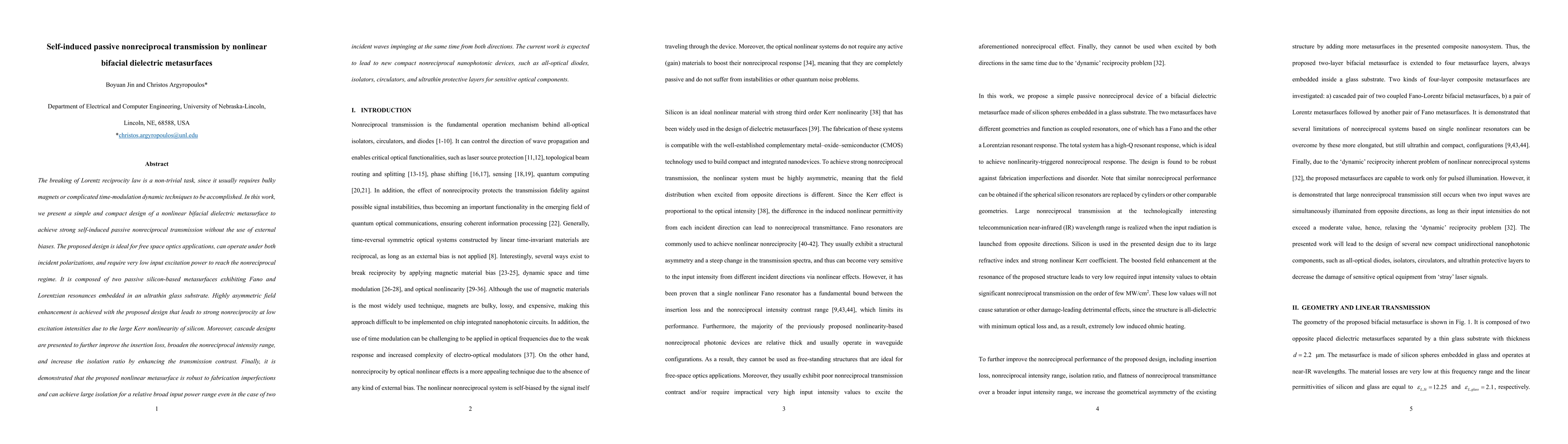 The breaking of Lorentz reciprocity law is a non-trivial task, since it usually requires bulky magnets or complicated time-modulation dynamic techniques to be accomplished. In this work, we present a simple and compact design of a nonlinear bifacial dielectric metasurface to achieve strong self-induced passive nonreciprocal transmission without the use of external biases. The proposed design is ideal for free space optics applications, can operate under both incident polarizations, and require very low input excitation power to reach the nonreciprocal regime. It is composed of two passive silicon-based metasurfaces exhibiting Fano and Lorentzian resonances embedded in an ultrathin glass substrate. Highly asymmetric field enhancement is achieved with the proposed design that leads to strong nonreciprocity at low excitation intensities due to the large Kerr nonlinearity of silicon. Moreover, cascade designs are presented to further improve the insertion loss, broaden the nonreciprocal intensity range, and increase the isolation ratio by enhancing the transmission contrast. Finally, it is demonstrated that the proposed nonlinear metasurface is robust to fabrication imperfections and can achieve large isolation for a relative broad input power range even in the case of two incident waves impinging at the same time from both directions. The current work is expected to lead to new compact nonreciprocal nanophotonic devices, such as all-optical diodes, isolators, circulators, and ultrathin protective layers for sensitive optical components.