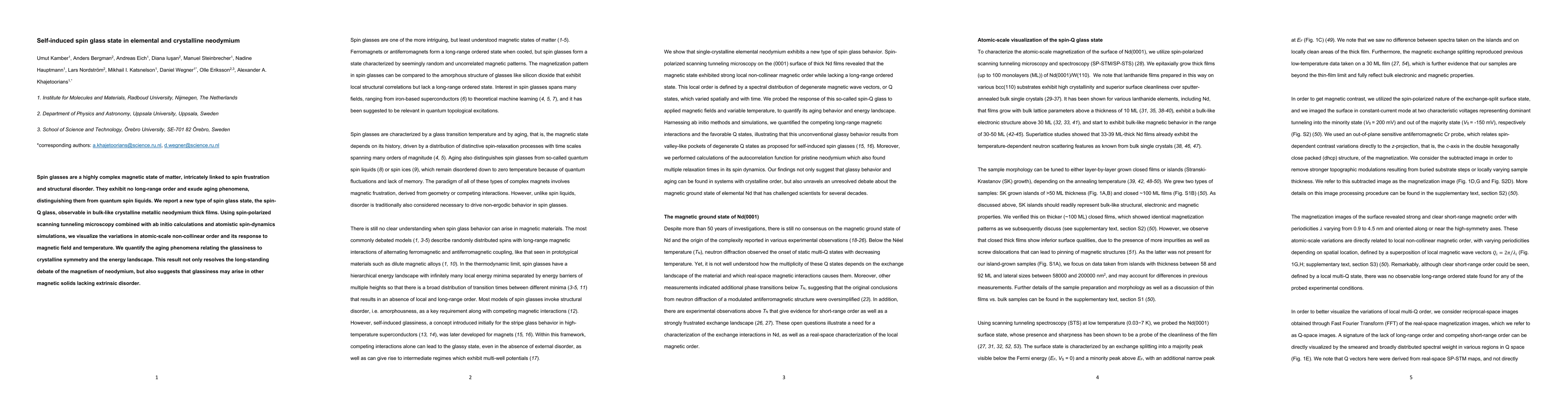 This study reveals a novel spin-Q glass state in crystalline metallic neodymium, characterized by atomic-scale non-collinear order and aging phenomena, using advanced microscopy and simulations. This finding resolves the magnetism of neodymium and suggests that intrinsic glassiness can occur in magnetic solids without structural disorder.