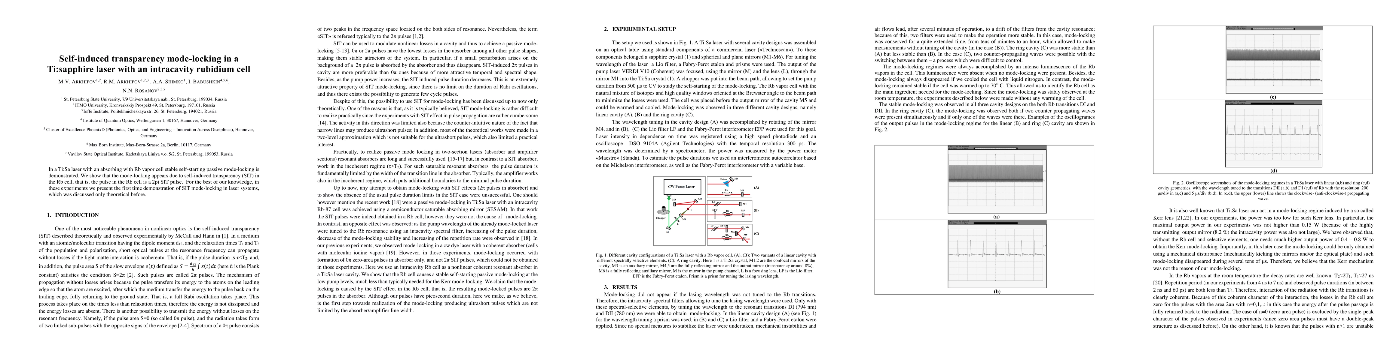 This paper demonstrates the first experimental realization of self-induced transparency (SIT) mode-locking in a Ti:sapphire laser using an intracavity rubidium cell, showing stable, self-starting passive mode-locking due to the 2π SIT pulse in the Rb vapor. This marks the first practical application of SIT mode-locking, previously only theoretical.