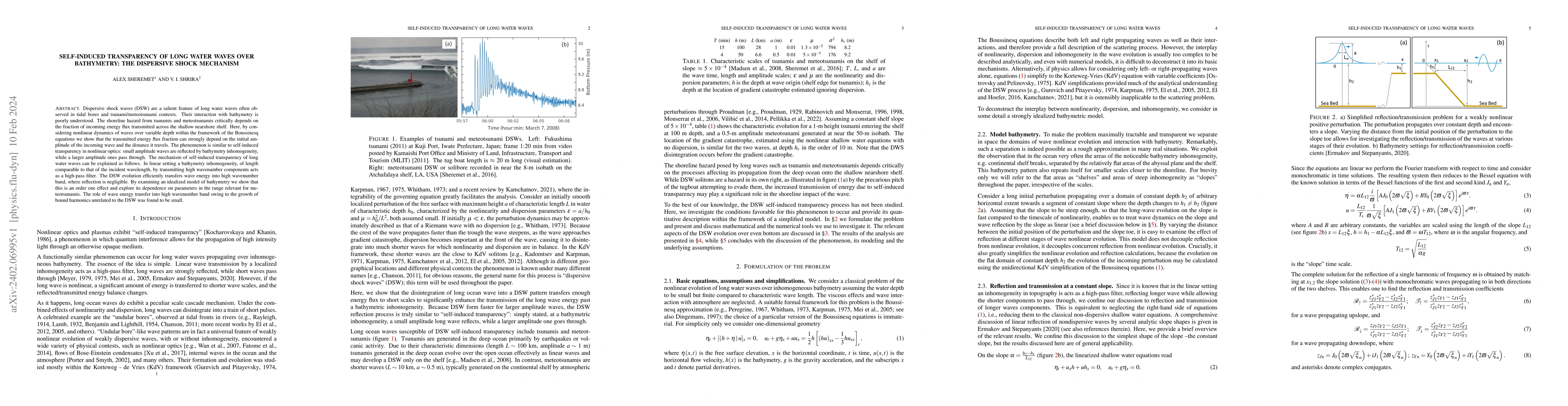 Dispersive shock waves (DSW) are a salient feature of long water waves often observed in tidal bores and tsunami/meteotsunami contexts. Their interaction with bathymetry is poorly understood. The shoreline hazard from tsunamis and meteotsunamis critically depends on the fraction of incoming energy flux transmitted across the shallow nearshore shelf. Here, by considering nonlinear dynamics of waves over variable depth within the framework of the Boussinesq equations we show that the transmitted energy flux fraction can strongly depend on the initial amplitude of the incoming wave and the distance it travels. The phenomenon is similar to self-induced transparency in nonlinear optics: small amplitude waves are reflected by bathymetry inhomogeneity, while a larger amplitude ones pass through. The mechanism of self-induced transparency of long water waves can be explained as follows. In linear setting a bathymetry inhomogeneity, of length comparable to that of the incident wavelength, by transmitting high wavenumber components acts as a high-pass filter. The DSW evolution efficiently transfers wave energy into high wavenumber band, where reflection is negligible. By examining an idealized model of bathymetry we show that this is an order one effect and explore its dependence on parameters in the range relevant for meteotsunamis. The role of wave energy transfer into high wavenumber band owing to the growth of bound harmonics unrelated to the DSW was found to be small.