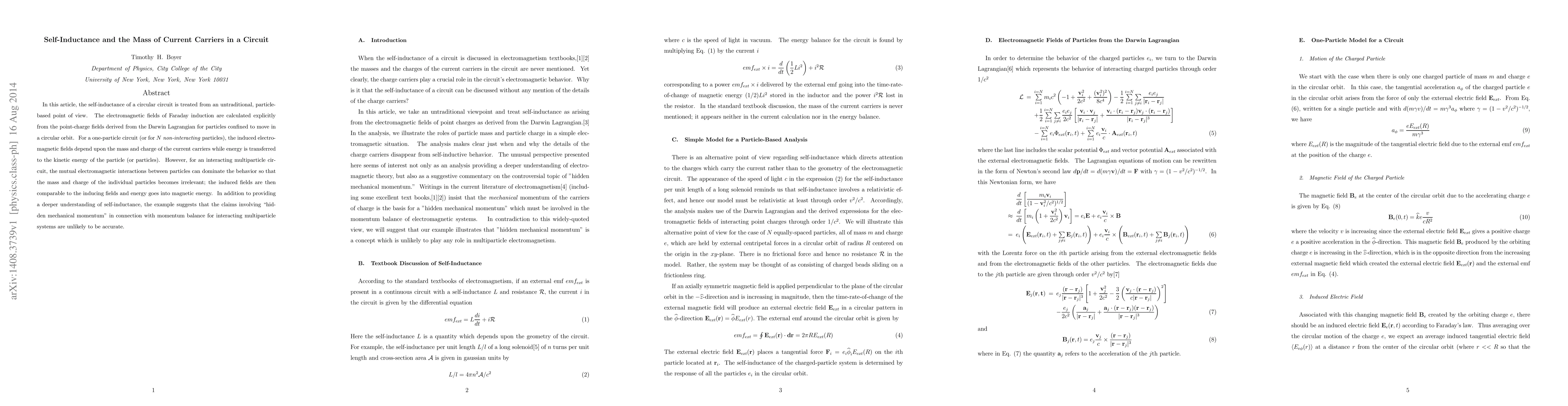 In this article, the self-inductance of a circular circuit is treated from an untraditional, particle-based point of view. The electromagnetic fields of Faraday induction are calculated explicitly from the point-charge fields derived from the Darwin Lagrangian for particles confined to move in a circular orbit. For a one-particle circuit (or for N non-interacting particles), the induced electromagnetic fields depend upon the mass and charge of the current carriers while energy is transferred to the kinetic energy of the particle (or particles). However, for an interacting multiparticle circuit, the mutual electromagnetic interactions between particles can dominate the behavior so that the mass and charge of the individual particles becomes irrelevant; the induced fields are then comparable to the inducing fields and energy goes into magnetic energy. In addition to providing a deeper understanding of self-inductance, the example suggests that the claims involving hidden mechanical momentum in connection with momentum balance for interacting multiparticle systems are unlikely to be accurate.