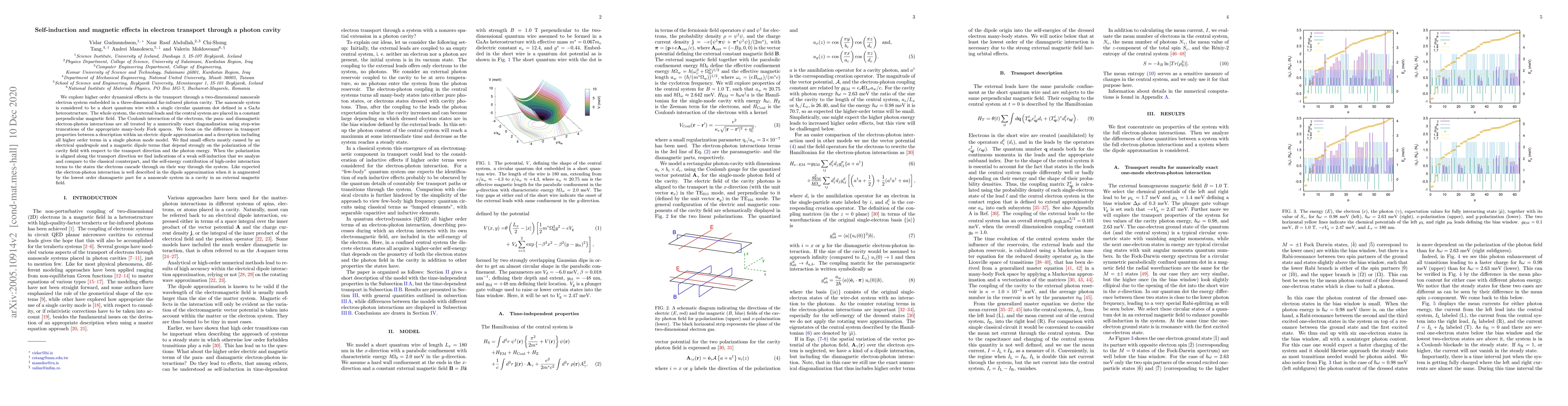The paper presents a detailed numerical analysis of higher-order dynamical effects in electron transport through a nanoscale system in a photon cavity, including self-induction and magnetic effects.