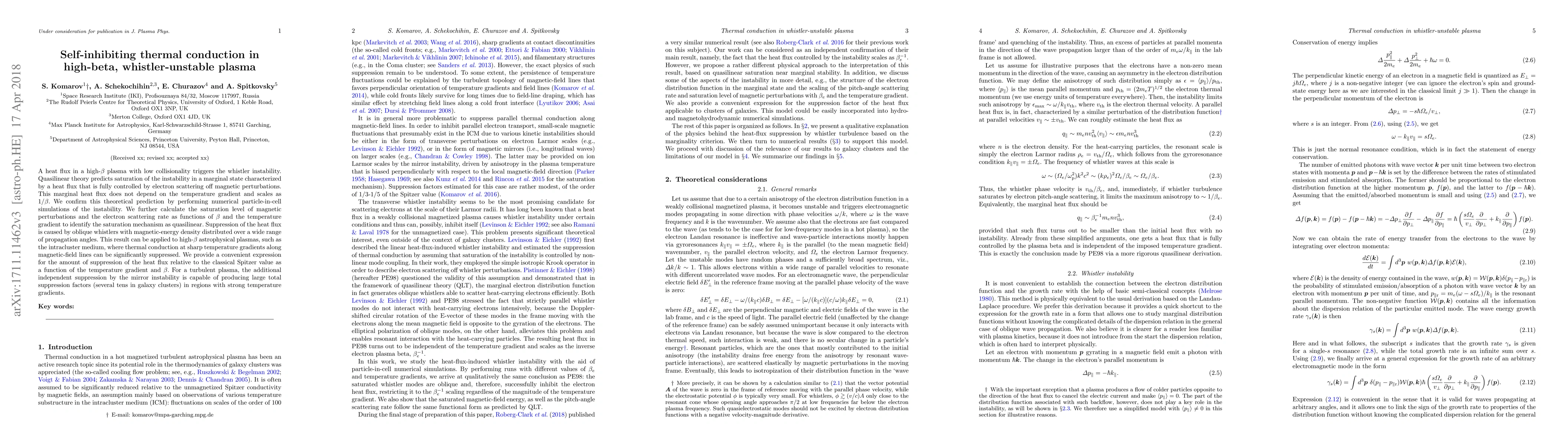 Researchers found that high-beta plasma can suppress thermal conduction through a whistler instability, with quasilinear theory confirmed in simulations.