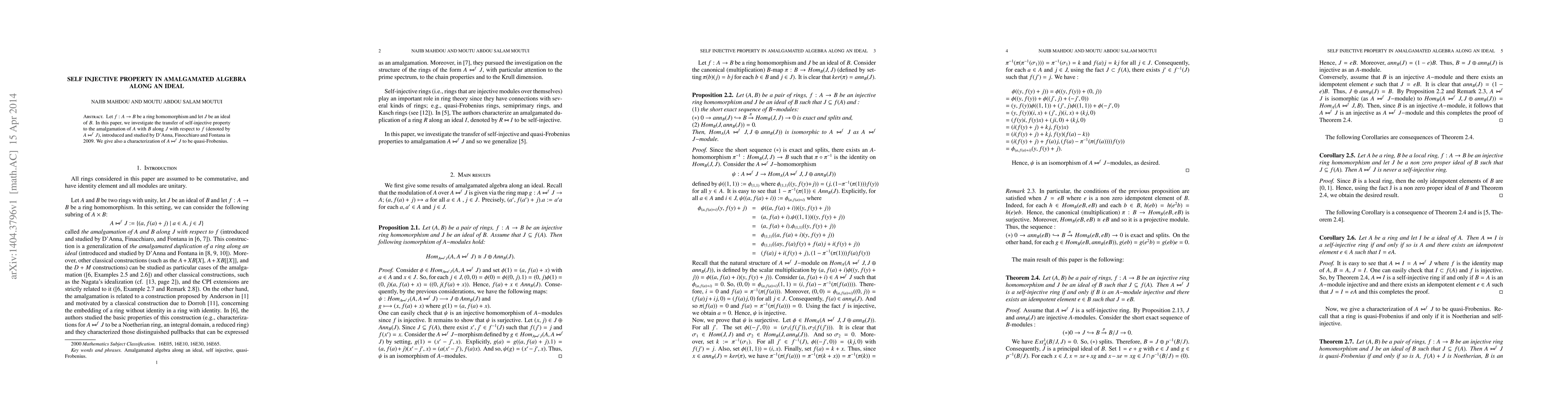 Let $f: A\rightarrow B$ be a ring homomorphism and let $J$ be an ideal of $B$. In this paper, we investigate the transfer of self-injective property to the amalgamation of $A$ with $B$ along $J$ with respect to $f$ (denoted by $A\bowtie^fJ),$ introduced and studied by D'Anna, Finocchiaro and Fontana in 2009. We give also a characterization of $A\bowtie^fJ$ to be quasi-Frobenius.
