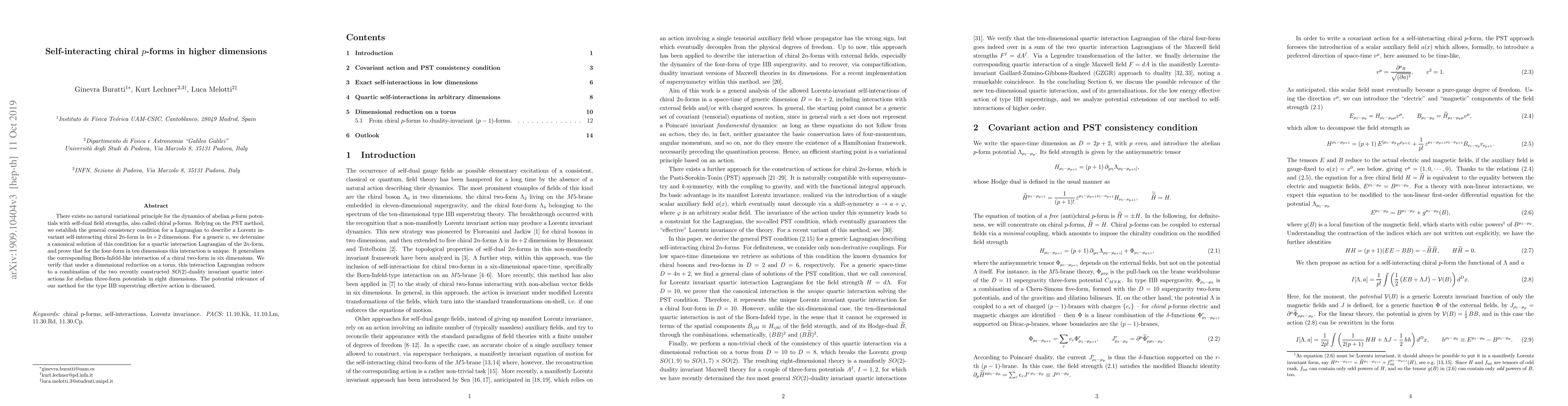 There exists no natural variational principle for the dynamics of abelian p-form potentials with self-dual field strengths, also called chiral p-forms. Relying on the PST method, we establish the general consistency condition for a Lagrangian to describe a Lorentz invariant self-interacting chiral 2n-form in 4n+2 dimensions. For a generic n, we determine a canonical solution of this condition for a quartic interaction Lagrangian of the 2n-form, and prove that for the four-form in ten dimensions this interaction is unique. It generalizes the corresponding Born-Infeld-like interaction of a chiral two-form in six dimensions. We verify that under a dimensional reduction on a torus, this interaction Lagrangian reduces to a combination of the two recently constructed SO(2)-duality invariant quartic interactions for abelian three-form potentials in eight dimensions. The potential relevance of our method for the type IIB superstring effective action is discussed.