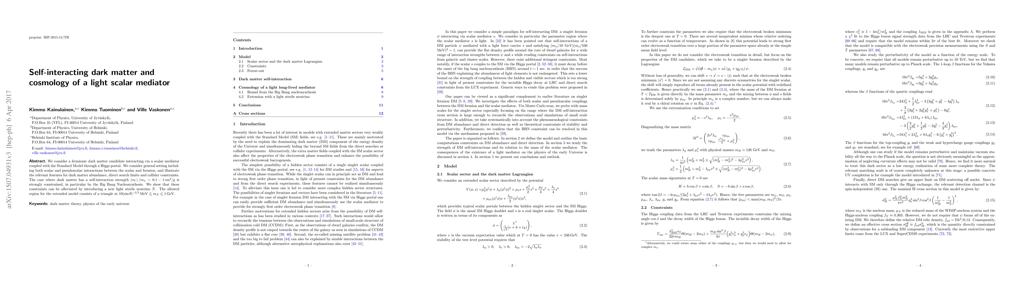We consider a fermionic dark matter candidate interacting via a scalar mediator coupled with the Standard Model through a Higgs portal. We consider general setting including both scalar and pseudoscalar interactions between the scalar and fermion, and illustrate the relevant features for dark matter abundance, direct search limits and collider constraints. The case where dark matter has a self-interaction strength $\left\langle \sigma_V \right\rangle/m_\psi \sim 0.1-1 \,\mathrm{cm}^2/\mathrm{g}$ is strongly constrained, in particular by the Big Bang Nucleosynthesis. We show that these constraints can be alleviated by introducing a new light sterile neutrino $N$. The allowed region for the extended model consists of a triangle at $10 (\sin \theta)^{-2/5} \,{\rm MeV} \lesssim m_N \lesssim 1\,{\rm GeV}$.
