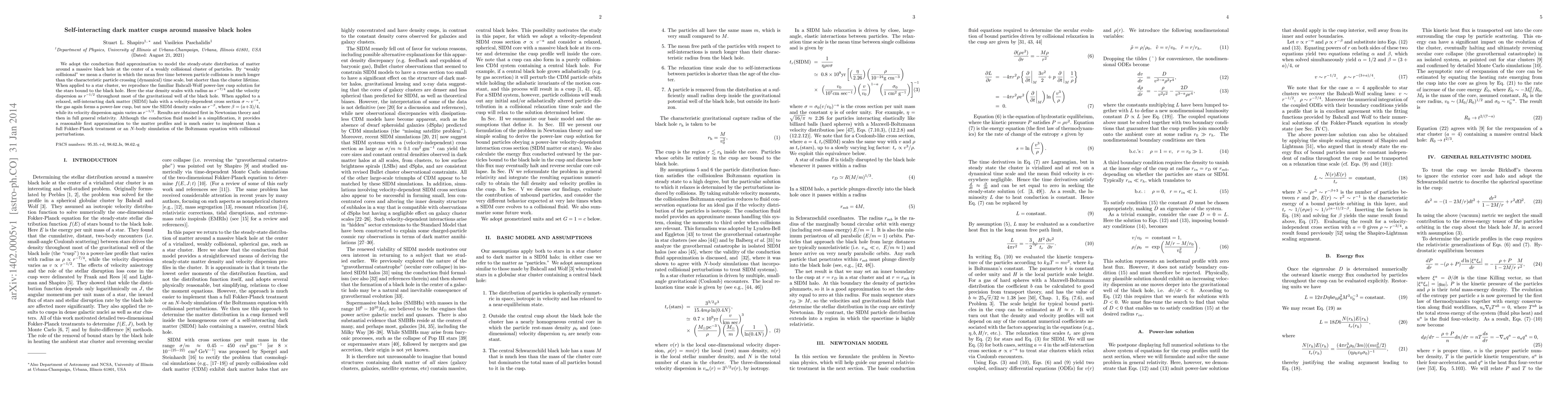We adopt the conduction fluid approximation to model the steady-state distribution of matter around a massive black hole at the center of a weakly collisional cluster of particles. By "`weakly collisional" we mean a cluster in which the mean free time between particle collisions is much longer than the characteristic particle crossing (dynamical) time scale, but shorter than the cluster lifetime. When applied to a star cluster, we reproduce the familiar Bahcall-Wolf power-law cusp solution for the stars bound to the black hole. Here the star density scales with radius as $r^{-7/4}$ and the velocity dispersion as $r^{-1/2}$ throughout most of the gravitational well of the black hole. When applied to a relaxed, self-interacting dark matter (SIDM) halo with a velocity-dependent cross section $\sigma \sim v^{-a}$, the gas again forms a power-law cusp, but now the SIDM density scales as $r^{-\beta}$, where $\beta = (a+3)/4$, while its velocity dispersion again varies as $r^{-1/2}$. Results are obtained first in Newtonian theory and then in full general relativity. Although the conduction fluid model is a simplification, it provides a reasonable first approximation to the matter profiles and is much easier to implement than a full Fokker-Planck treatment or an $N$-body simulation of the Boltzmann equation with collisional perturbations.