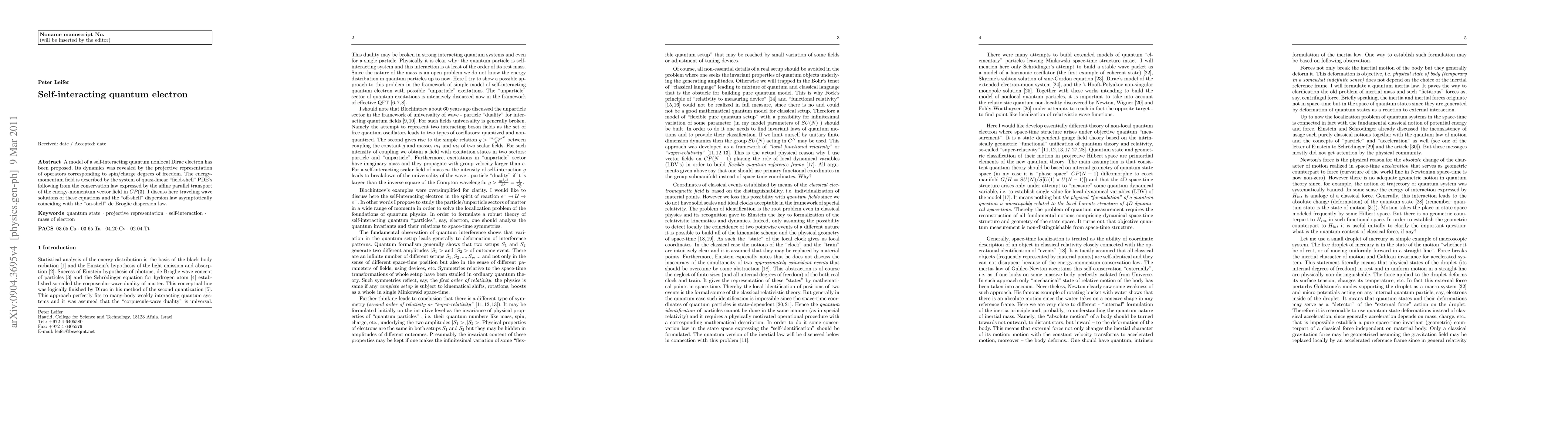 A model of self-interacting quantum non-local Dirac's electron has been proposed. Its dynamics was revealed by the projective representation of operators corresponding to spin/charge degrees of freedom. Energy-momentum field is described by the system of quasi-linear "field-shell" PDE's following from the conservation law expressed by the affine parallel transport of the energy momentum vector field in CP(3). I discuss here travel-wave solutions of these equations and the "off-shell" dispersion law asymptotically coinciding with the "on-shell" de Broglie dispersion law.